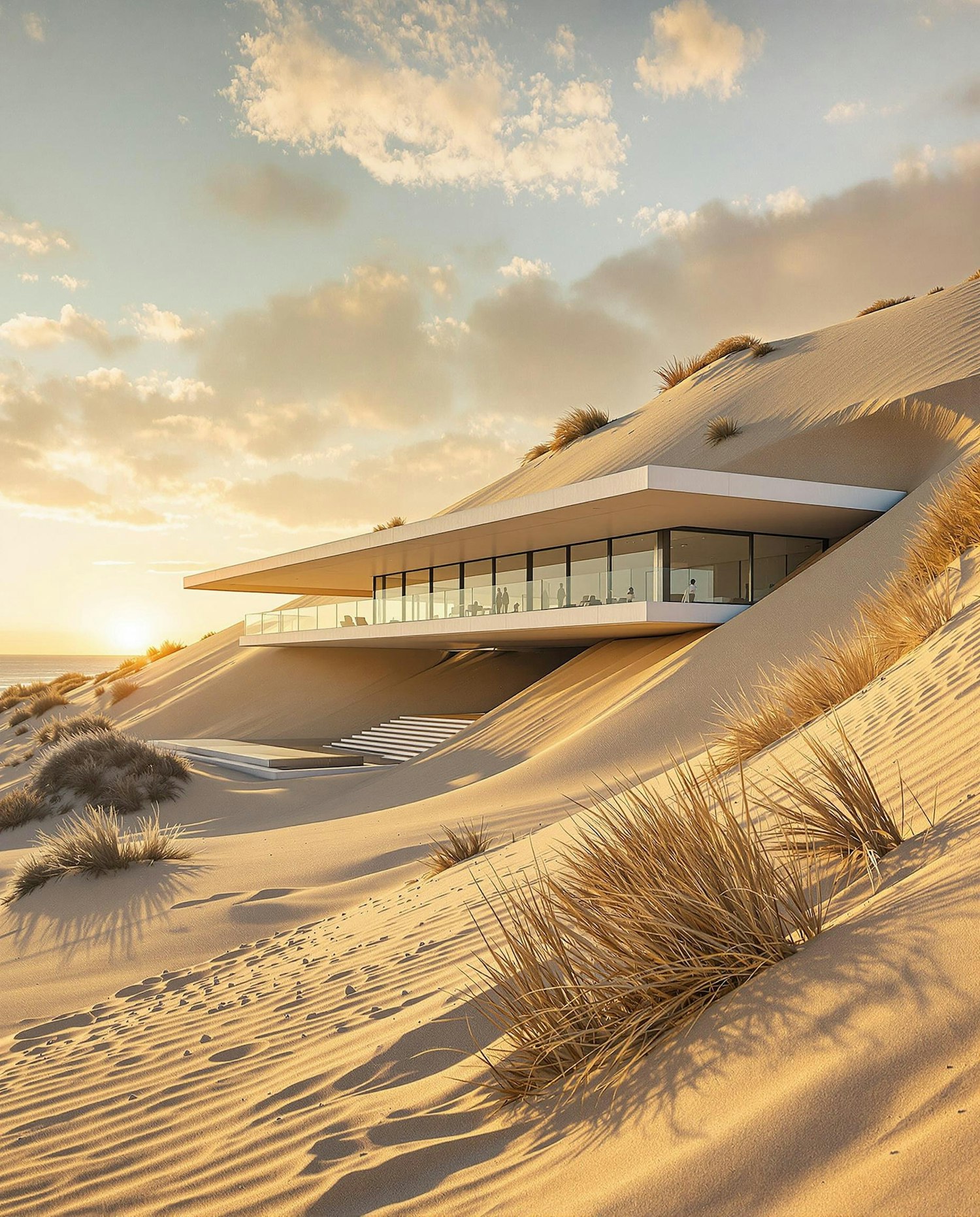 Modern glass-walled building nestled in golden sand dunes at sunset, blending sleek architecture with serene natural surroundings.