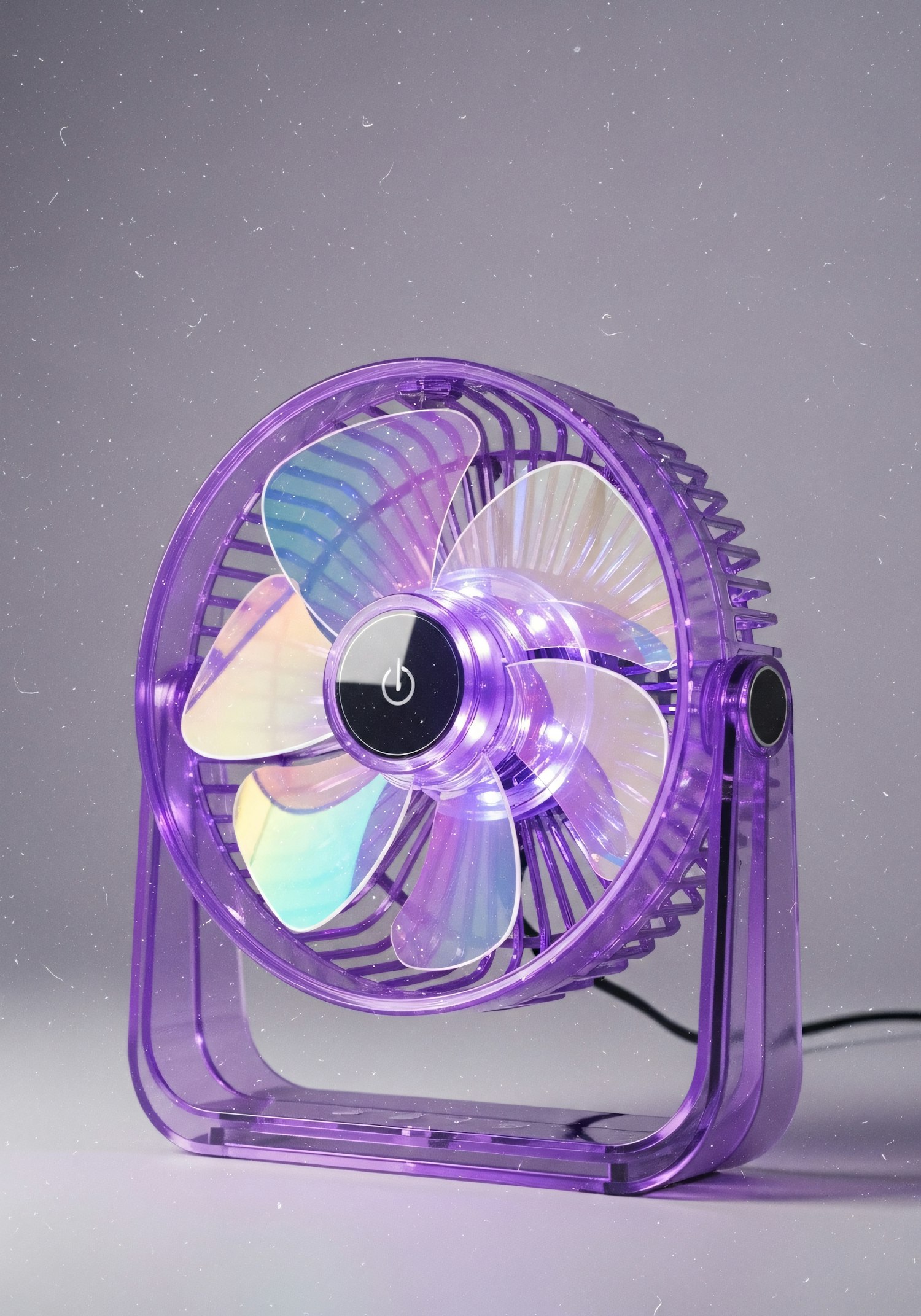 A stylish purple desk fan with iridescent blades, perfect for modern spaces. Its compact design combines functionality and aesthetics.