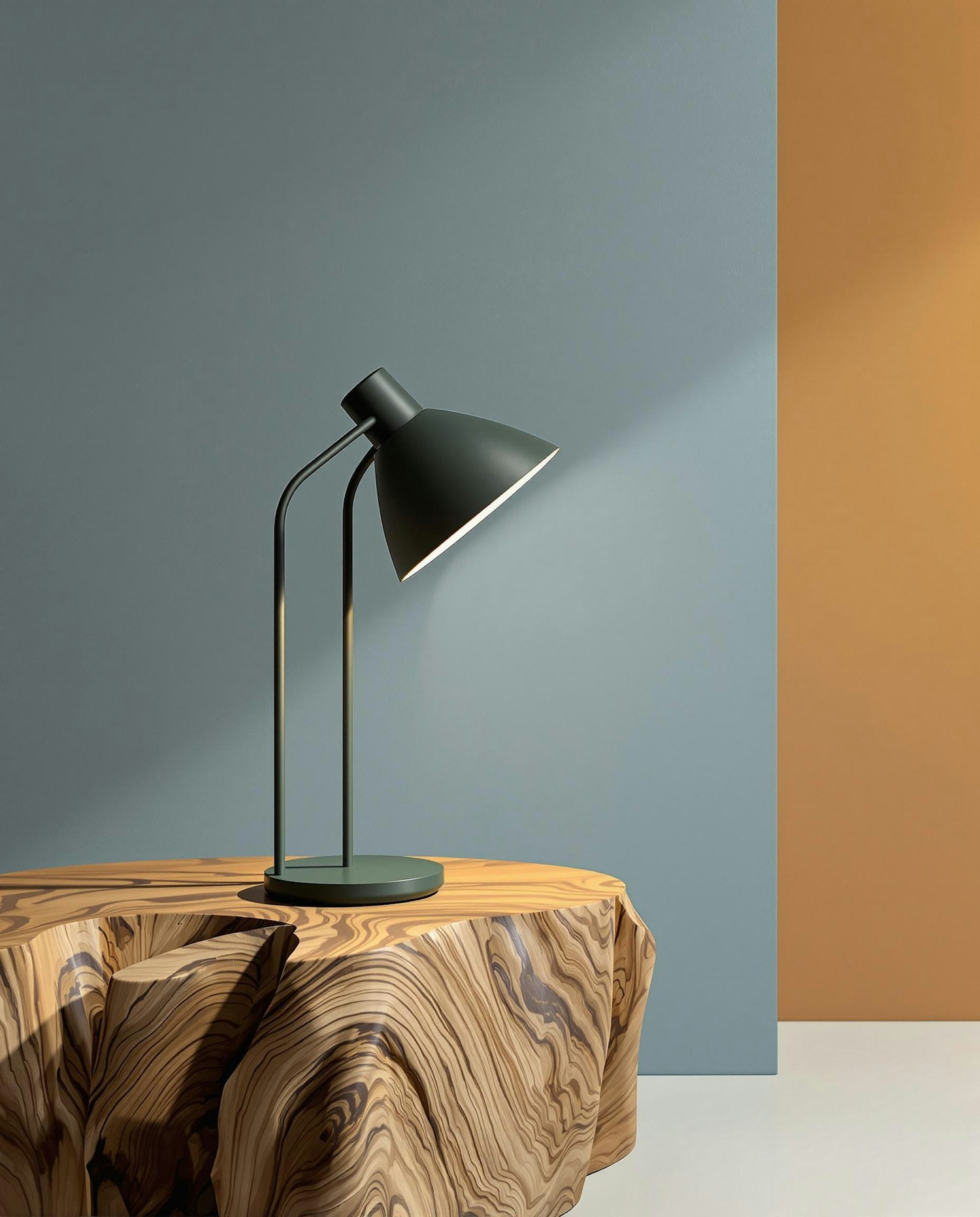 editorial product photo, dramatic studio lighting with soft shadows, carefully styled composition, bold modern background in expressive color or texture, refined materials, high contrast, clean lines, minimal-maximal art direction, luxury design magazine aesthetic a minimalist desk lamp in matte dark green metal, circular base, asymmetric shade, placed on a sculptural wooden desk with bold grain, background in pale grey-blue