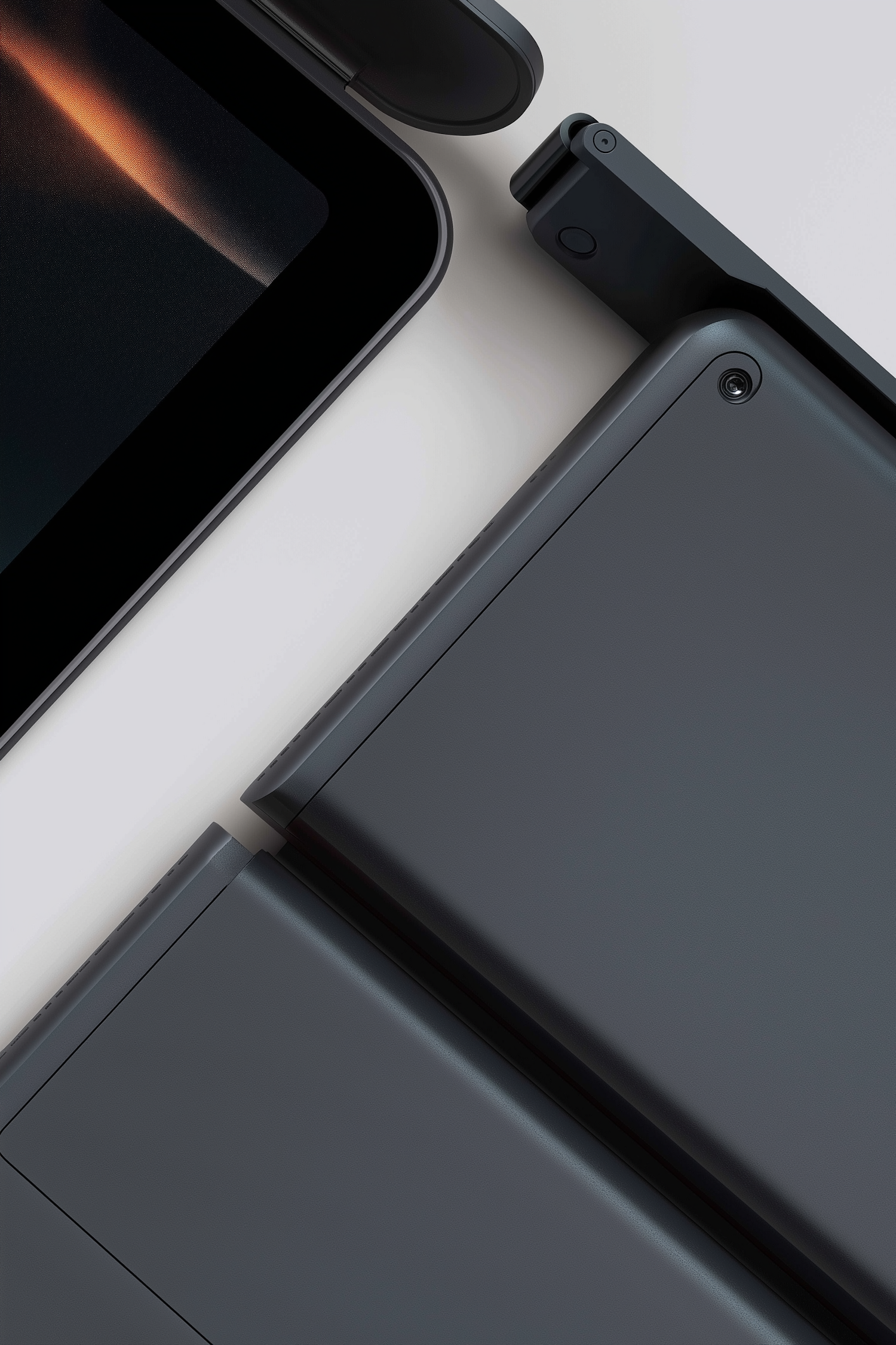 Close-up of a sleek, dark metallic electronic device with a hinge and screen, showcasing premium design and engineering details.