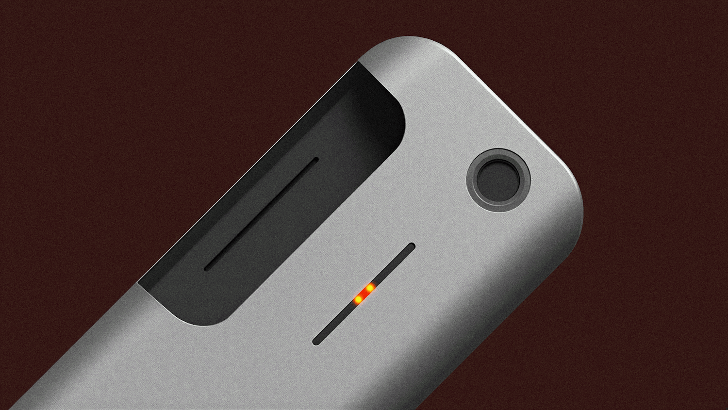 Close-up of a sleek metallic electronic device with a lens and illuminated orange lights, set against a dark brown background.