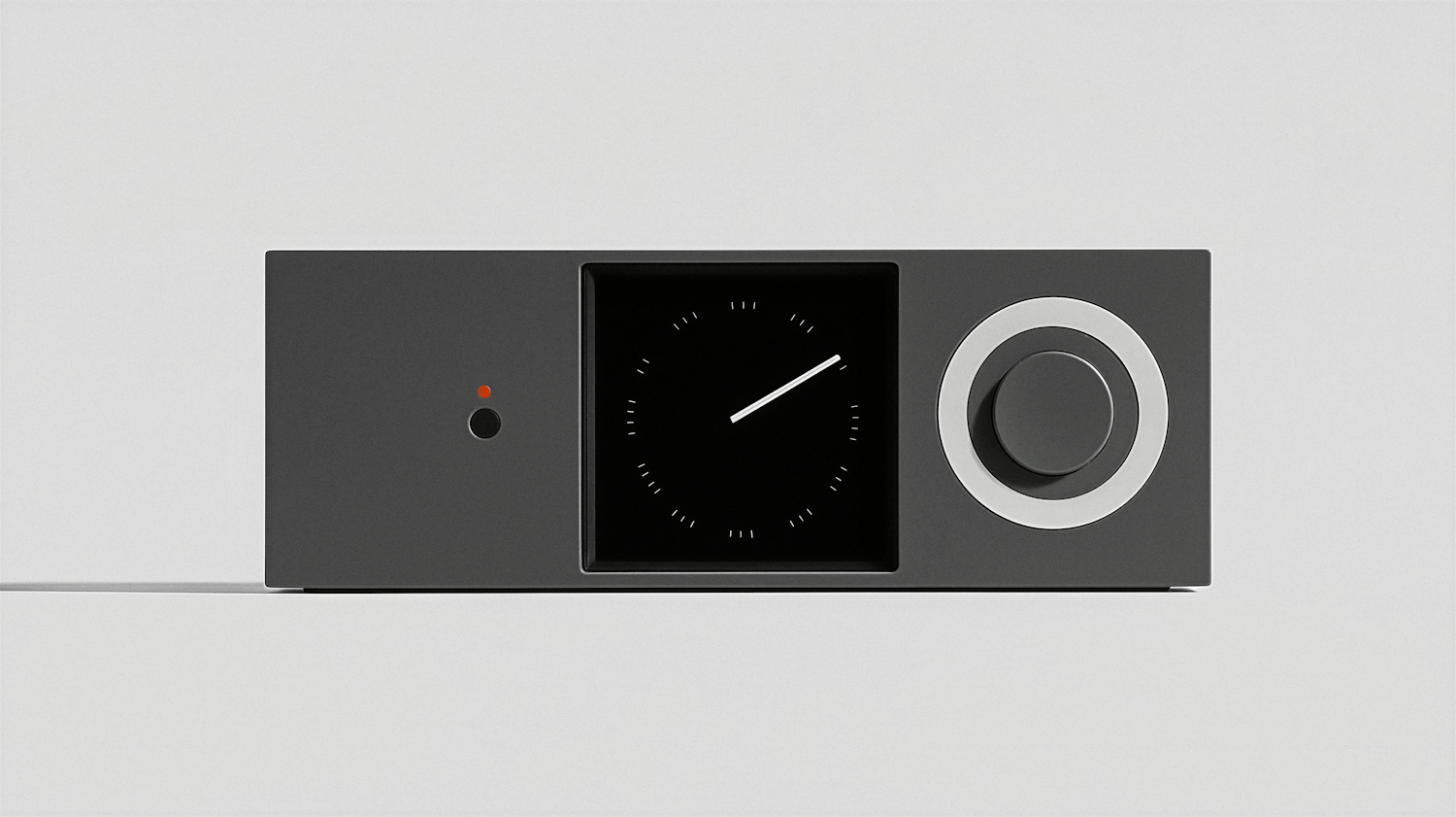 Minimalist black electronic device with a digital clock, a circular dial, and a sleek modern design.