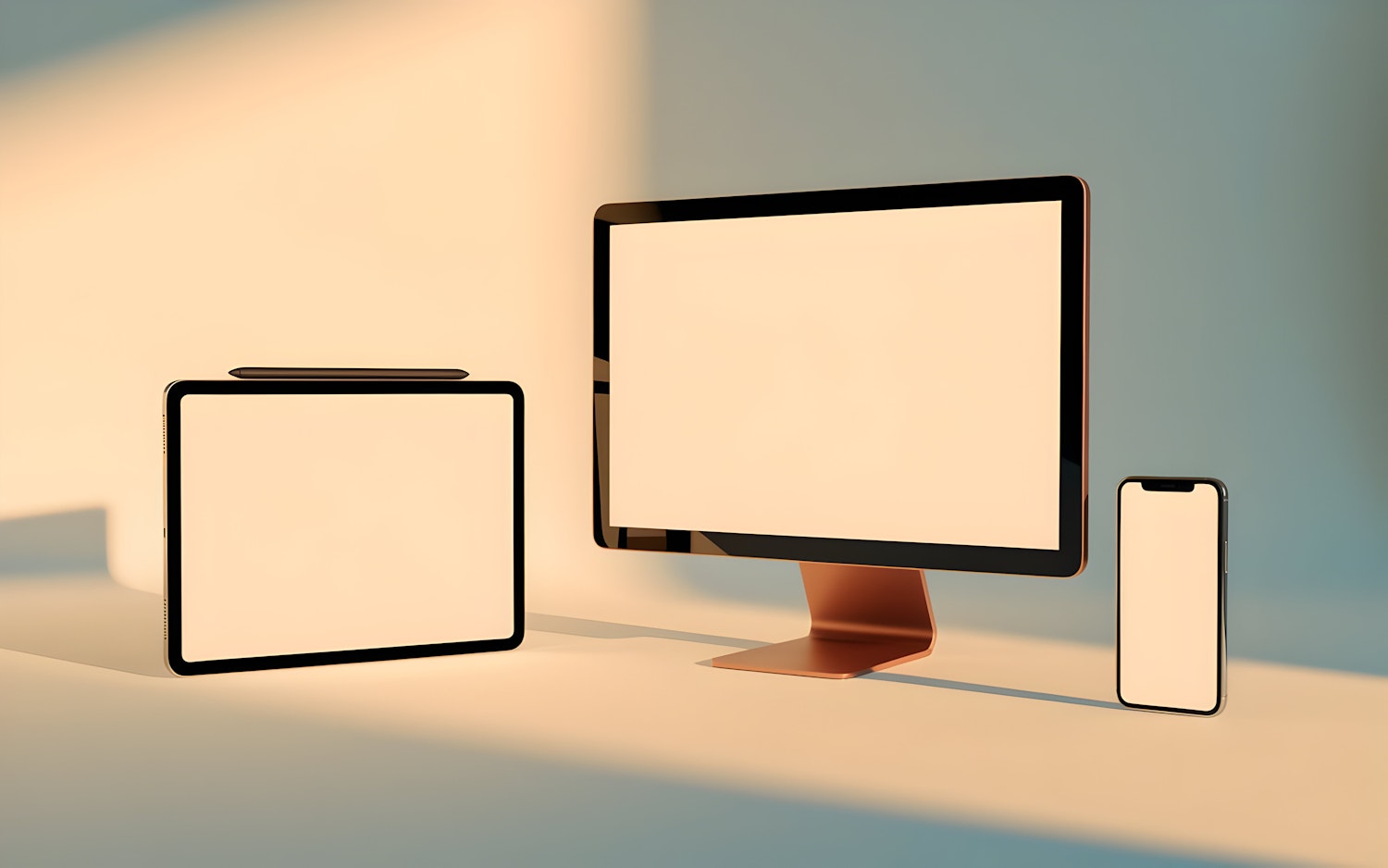 Modern tech setup with a tablet, desktop monitor, and smartphone in warm lighting. Sleek, minimalist design with a rose-gold monitor stand.