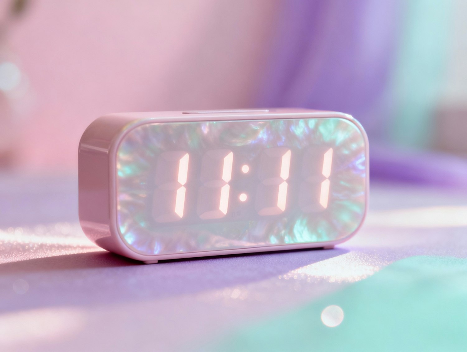 professional studio photo of a stylish digital clock with a pearlescent finish displaying 11:11, pastel tones, dreamy and minimal aesthetic,