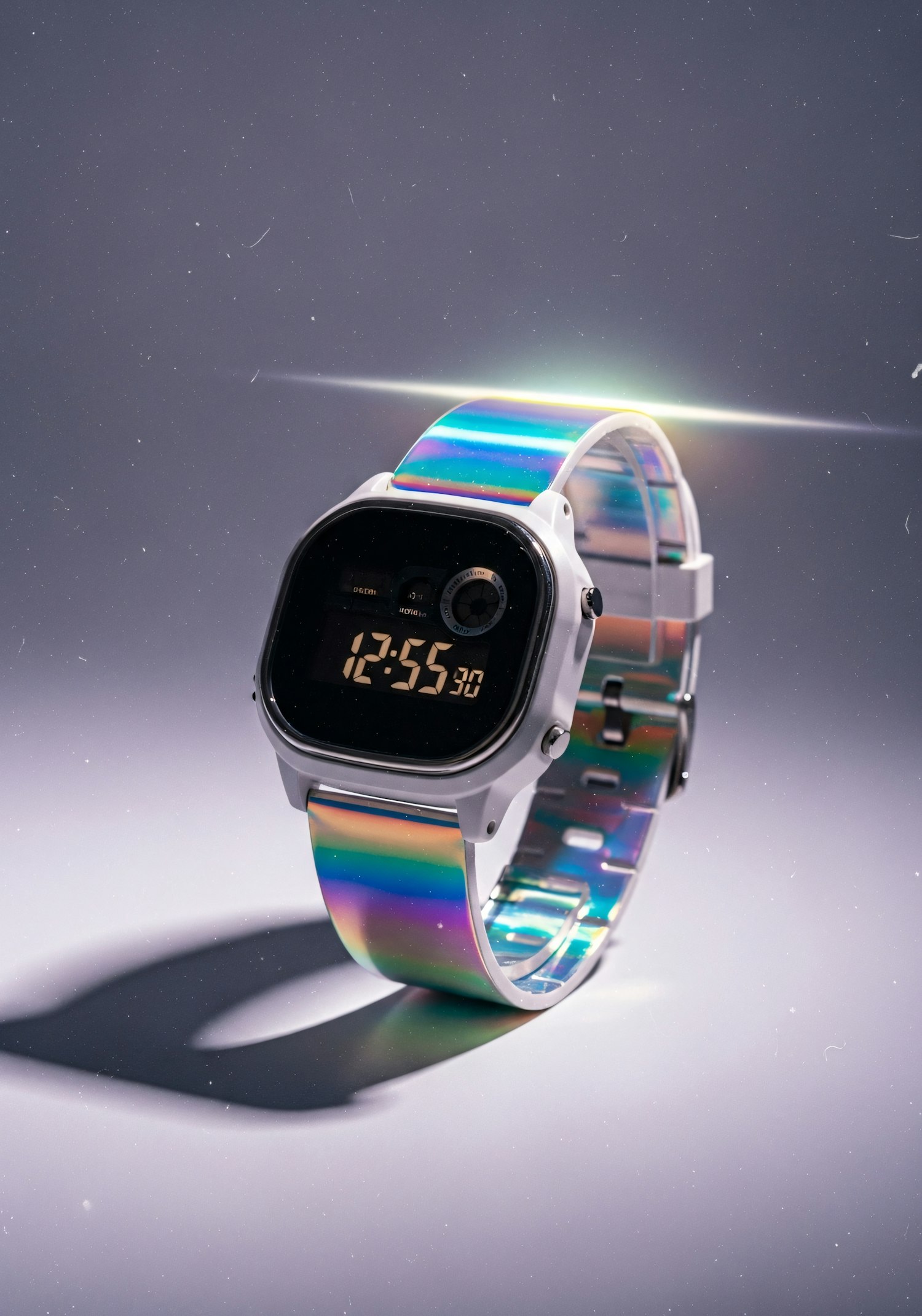 A stylish digital watch with a colorful iridescent strap, set against a neutral background, showcasing its modern design and vibrant colors.