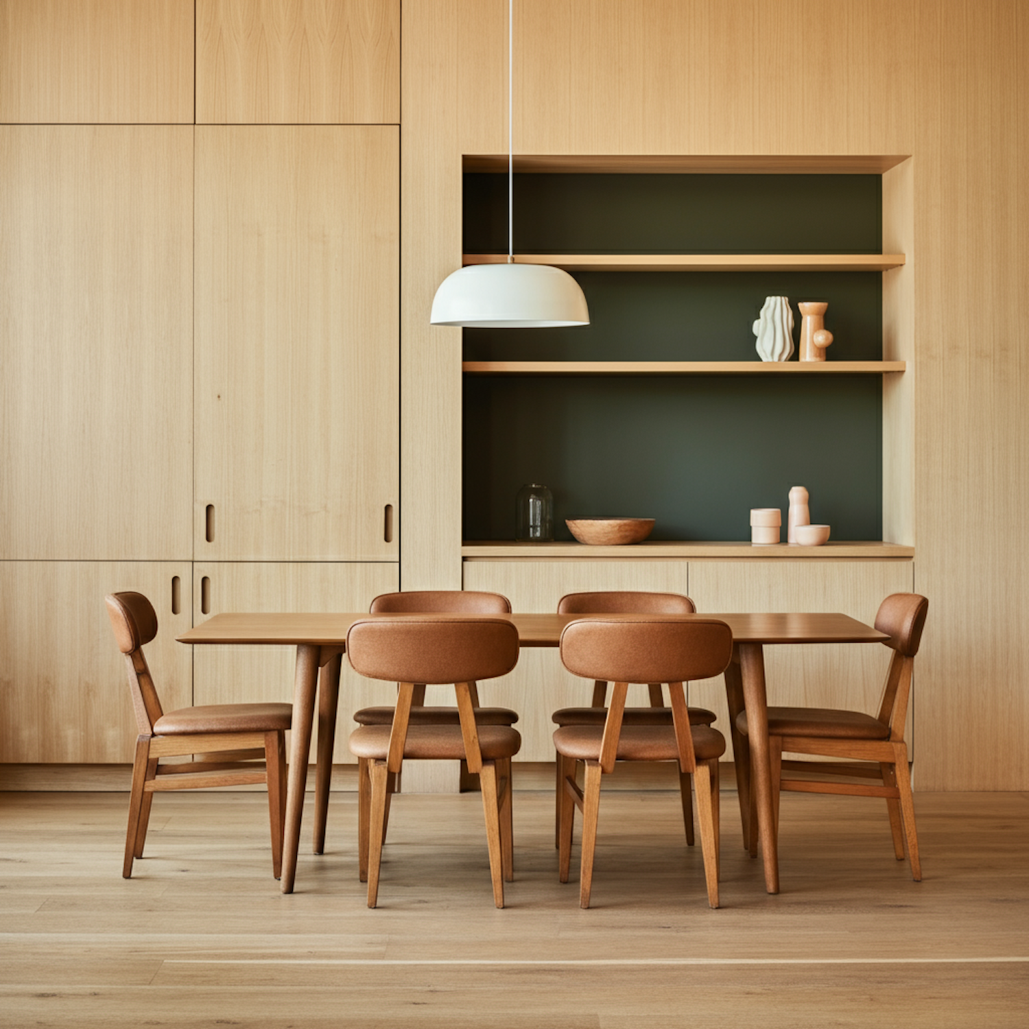 A cozy dining area with a wooden table, leather chairs, and minimalist decor on built-in shelves, perfect for modern interiors.
