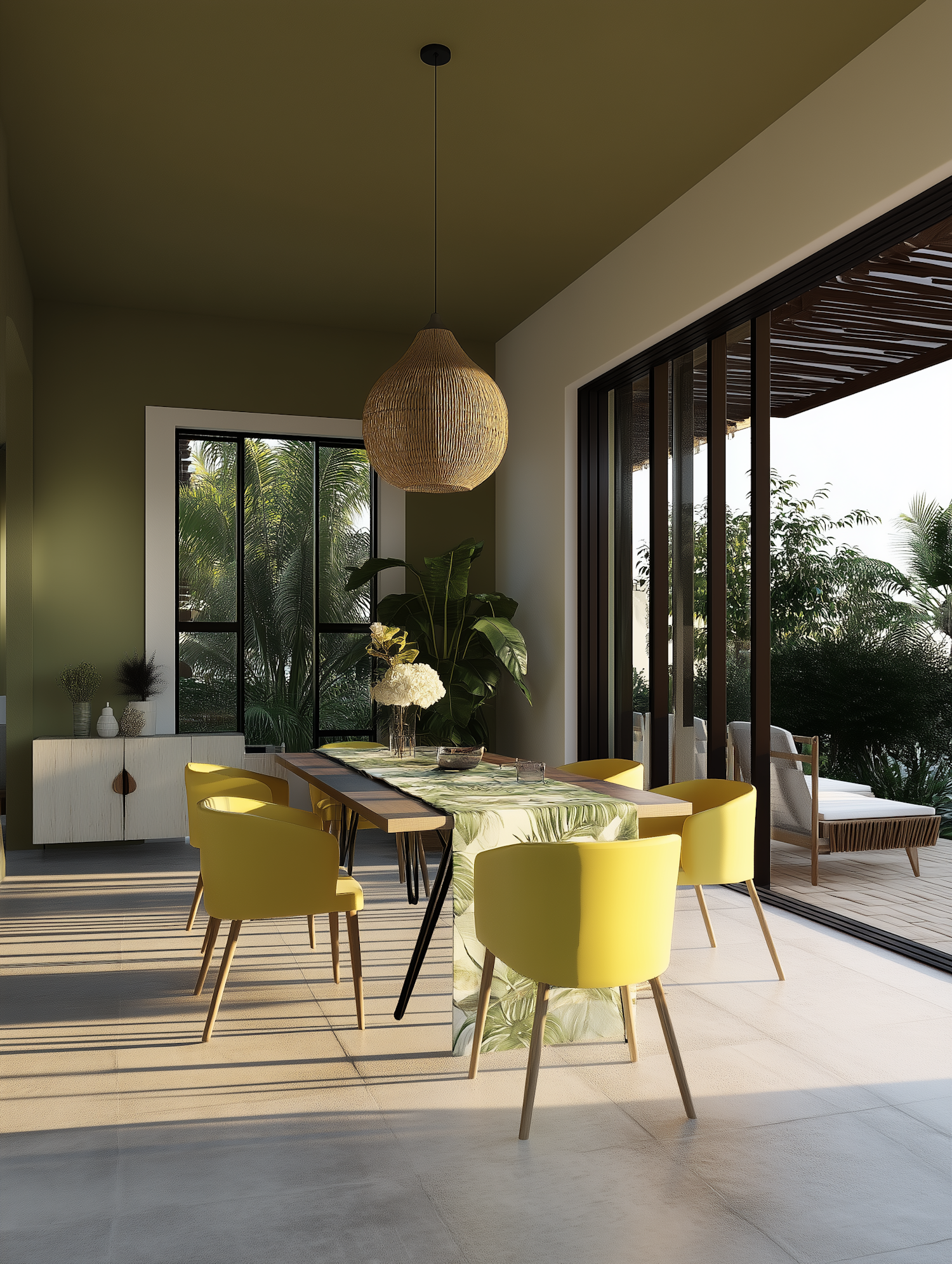 Bright dining room with yellow chairs, tropical decor, and lush outdoor views through large glass doors. Perfect blend of modern and natural.