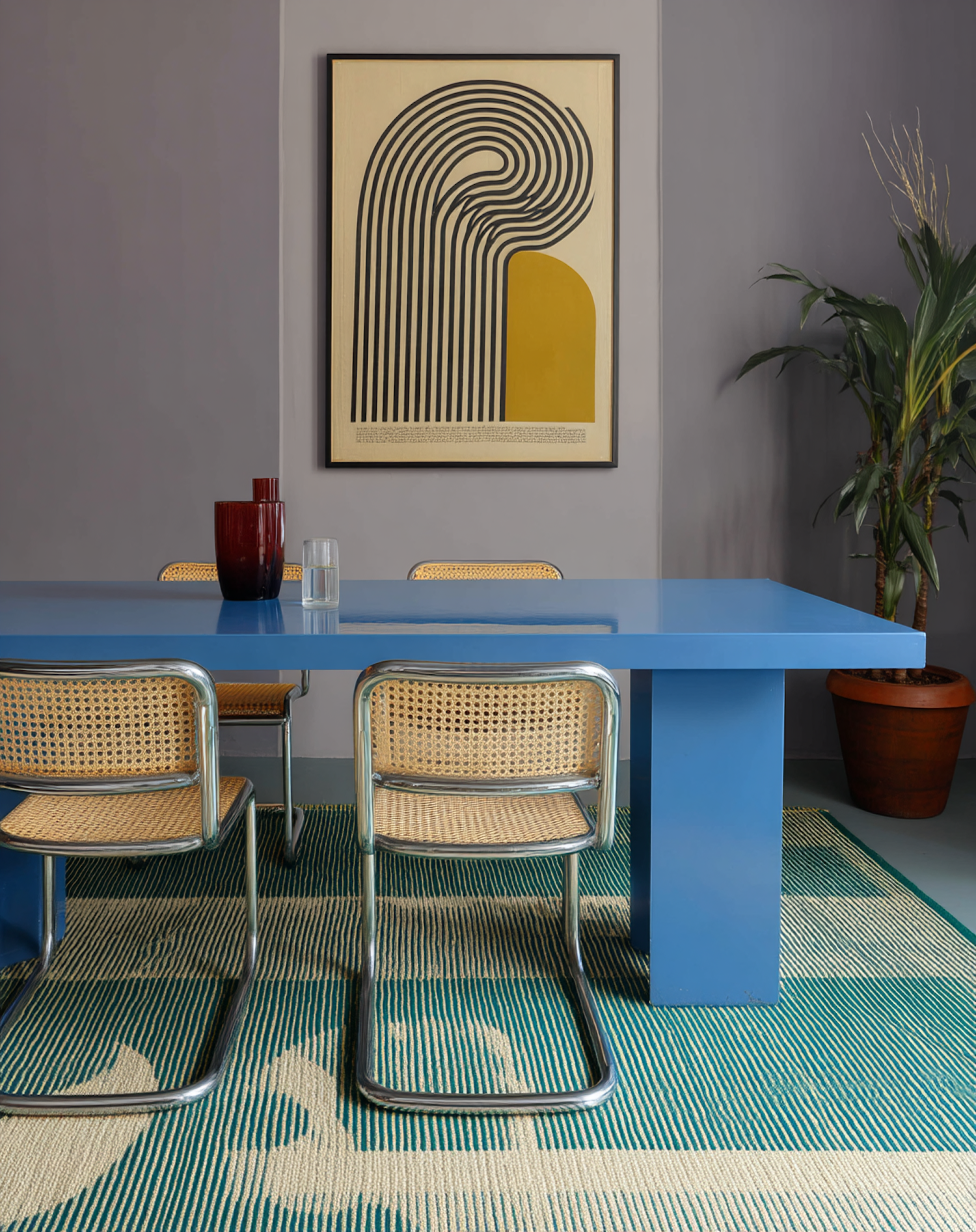 Modern dining room with a blue table, rattan chairs, abstract art, and a green patterned rug for a bold yet cozy vibe.