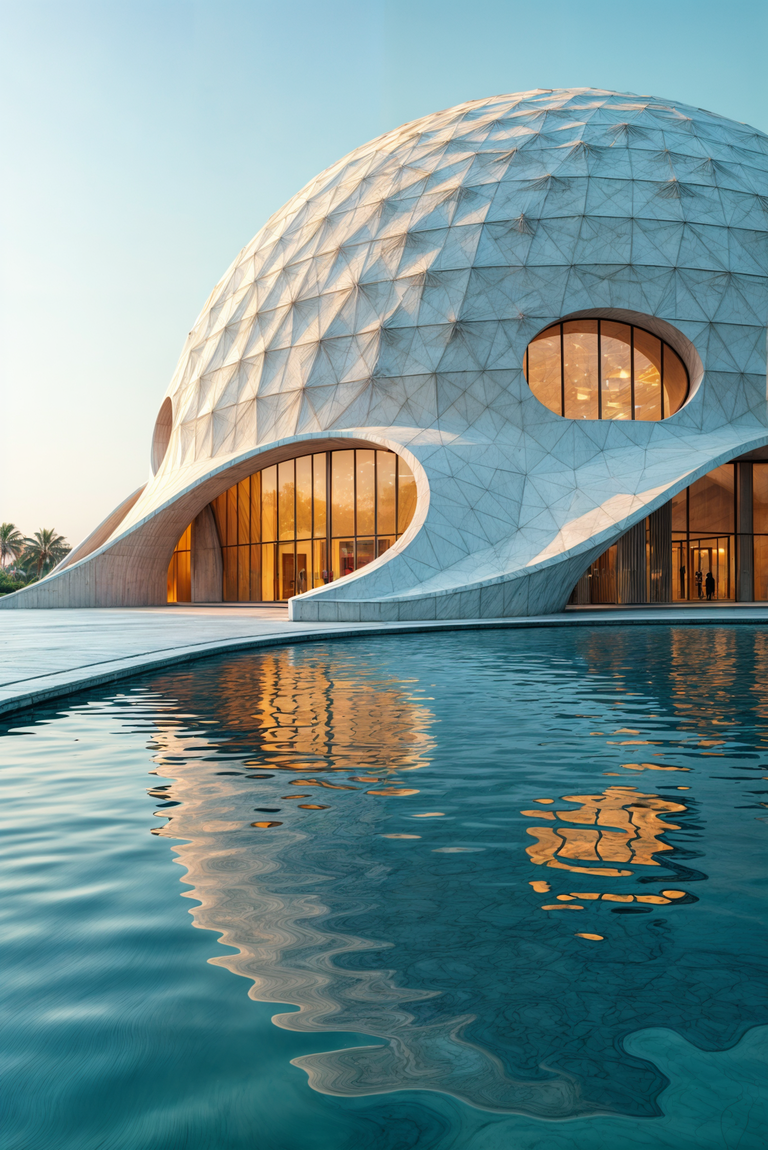Futuristic dome building with geometric design and reflective pool, set against a clear blue sky and palm trees.