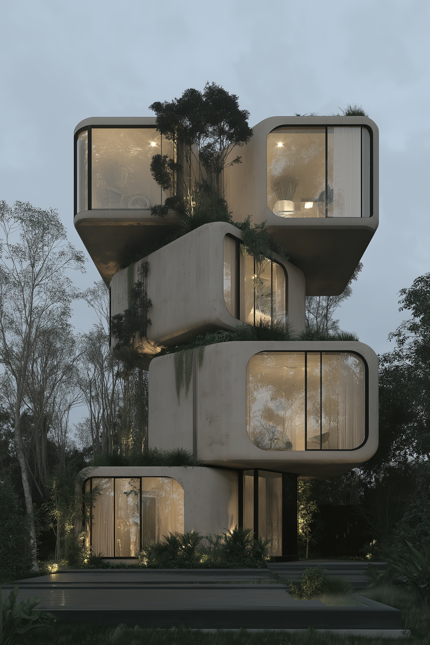 Modern stacked building with large glass windows, surrounded by lush greenery. Soft interior lighting contrasts with the overcast sky.