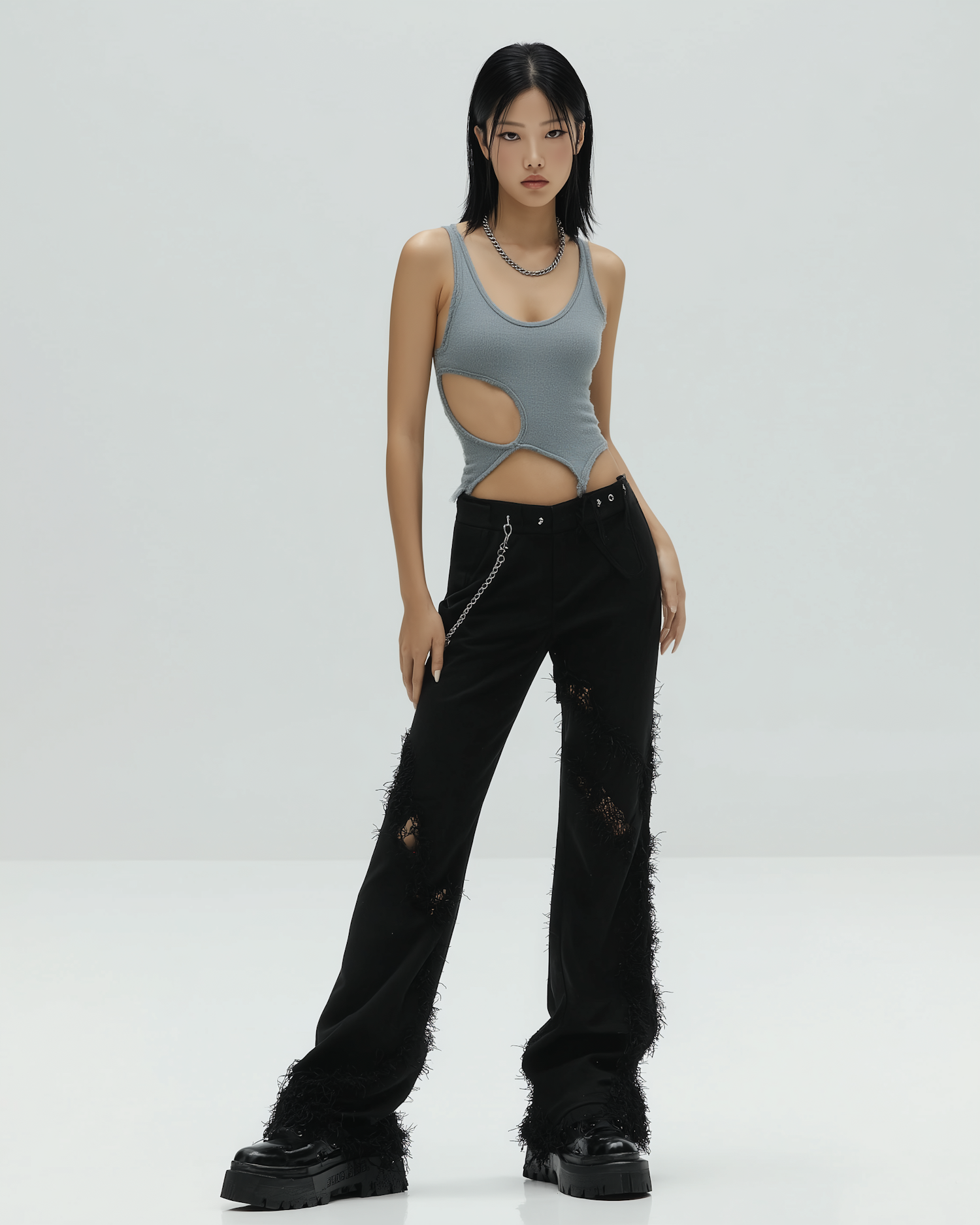 Stylish young woman in a gray cutout top and black textured pants, accessorized with chains and platform shoes, standing confidently.