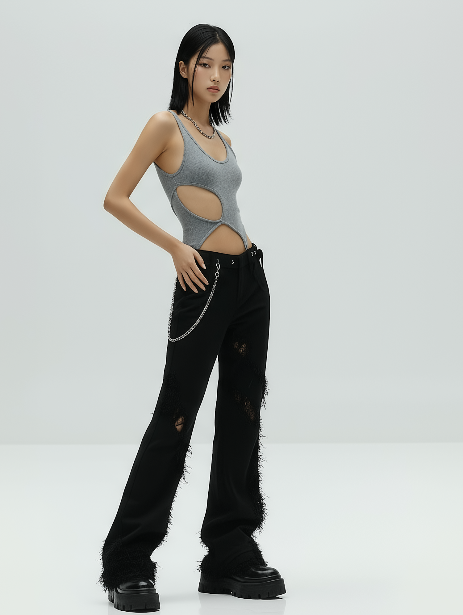 A stylish woman in a gray cutout top and black textured pants with platform shoes, showcasing a modern and edgy fashion look.