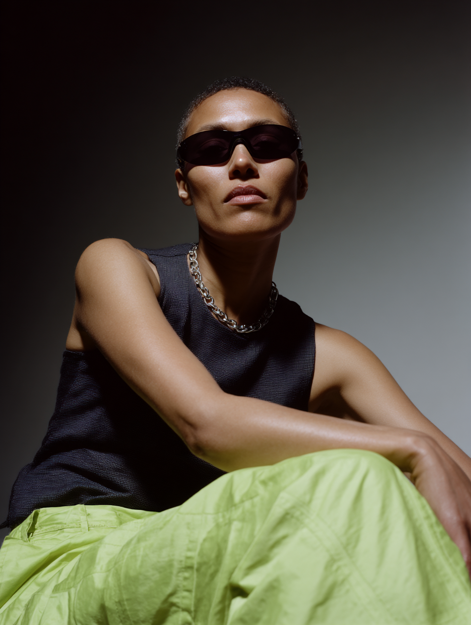 Confident individual in dark sunglasses, black top, lime-green pants, and silver chain necklace, posing against a neutral background.