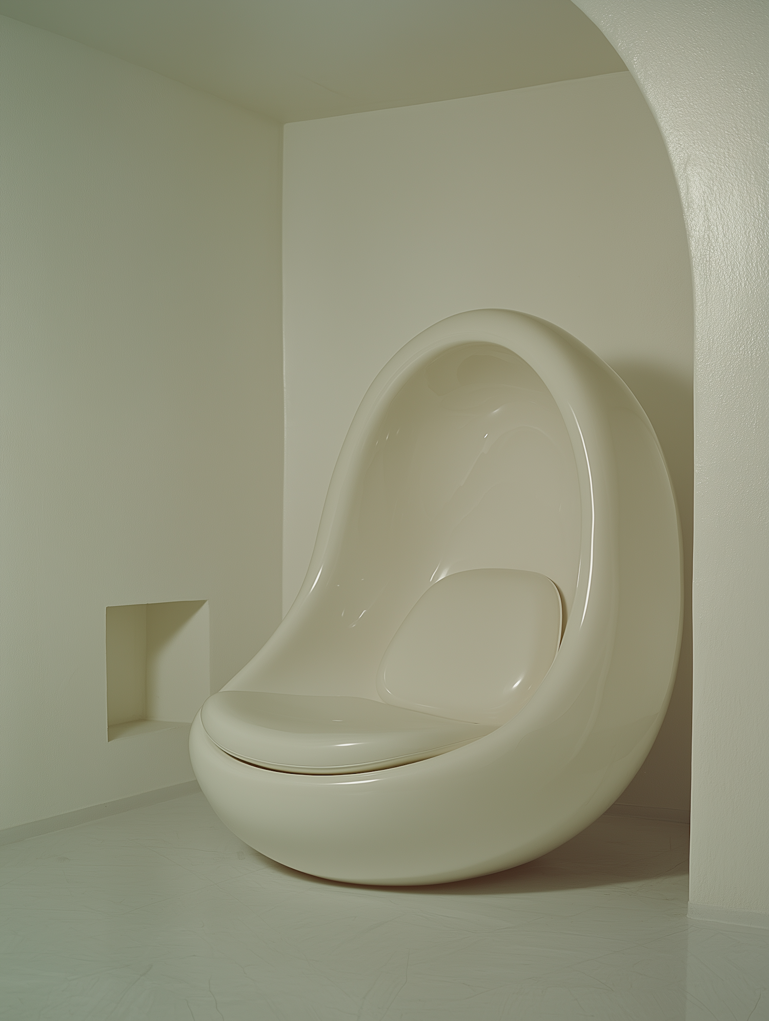 Modern egg-shaped chair in a minimalist room with soft neutral tones and elegant curves.