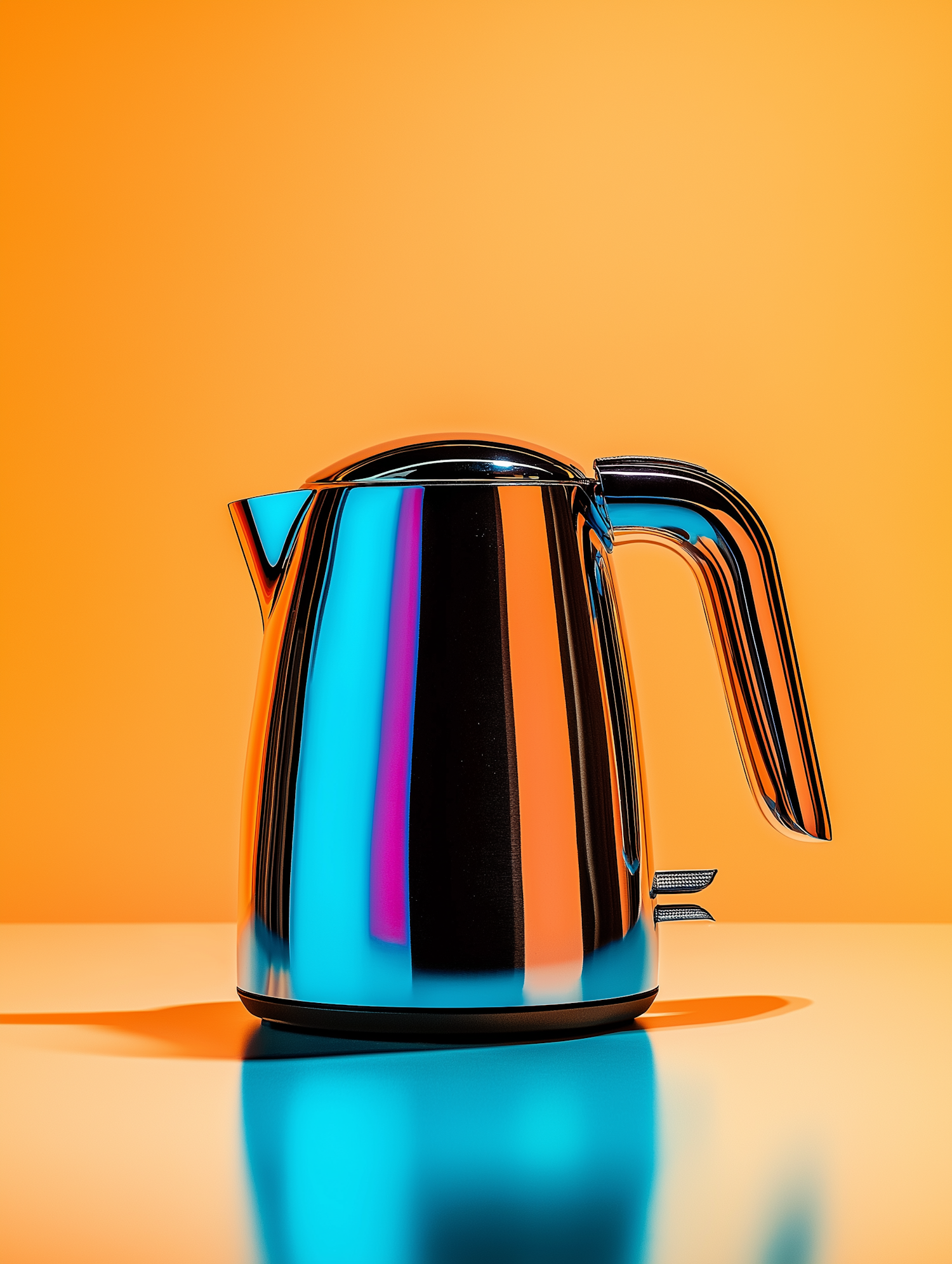 A shiny metallic electric kettle reflecting vibrant colors against a bright orange background, blending modern design with bold aesthetics.
