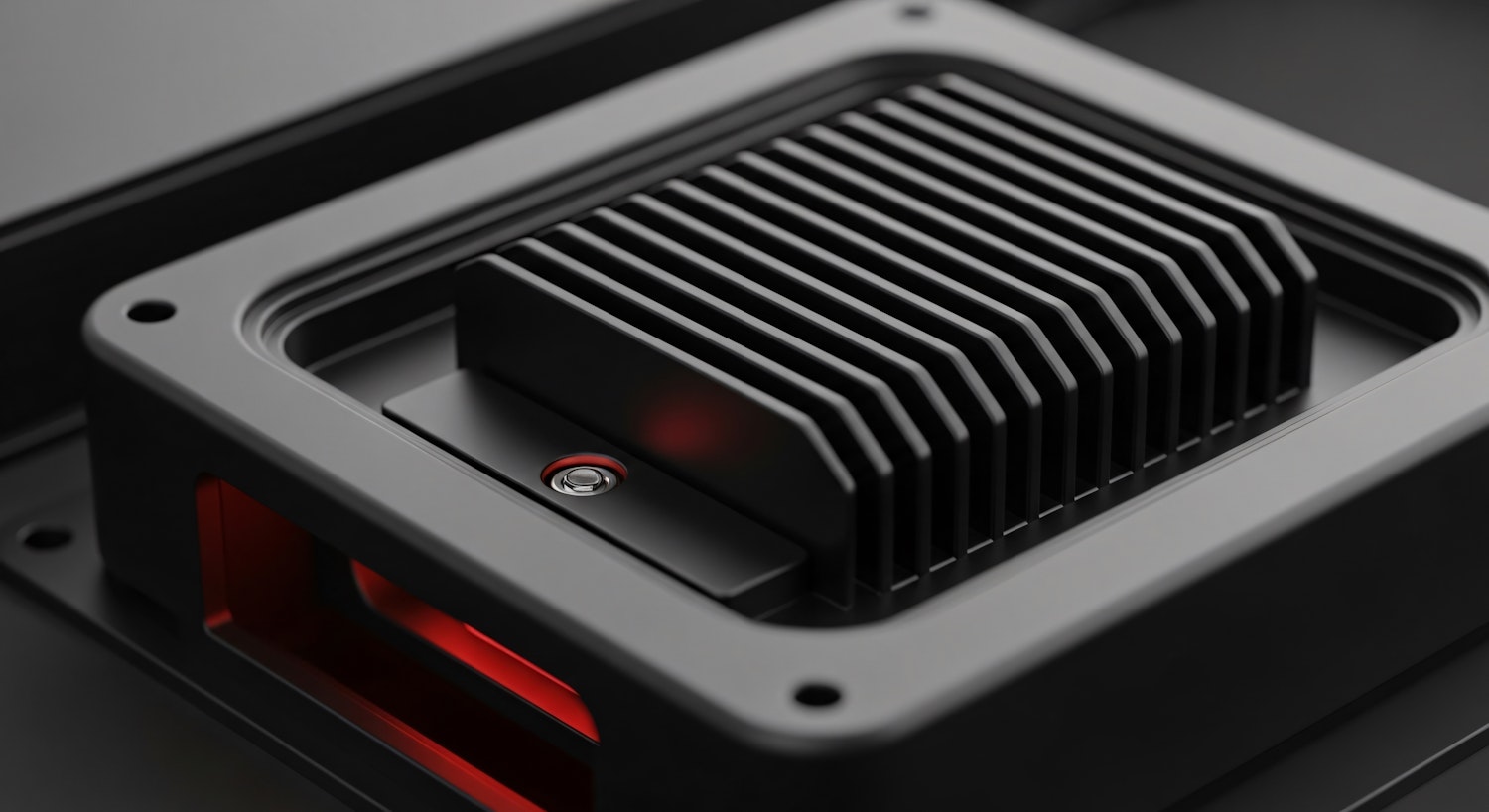 Close-up of a modern black heat sink with red accent lighting, showcasing sleek industrial design and efficient heat dissipation.