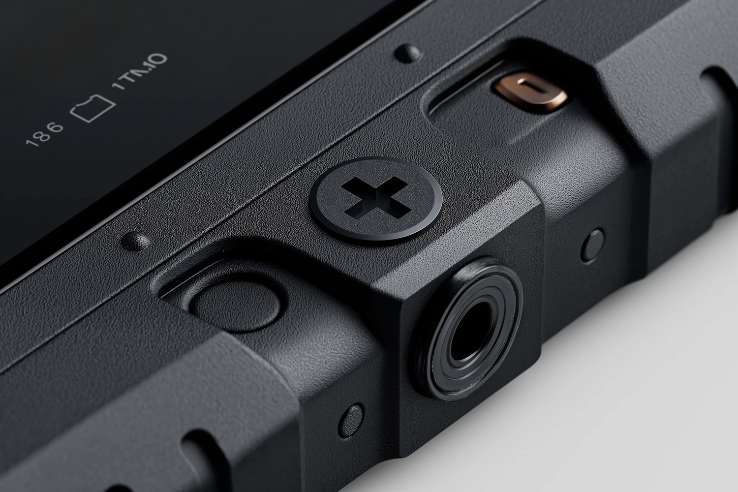 Close-up of a sleek black electronic device with a textured finish, featuring a circular button with an 'X' symbol and a small port.