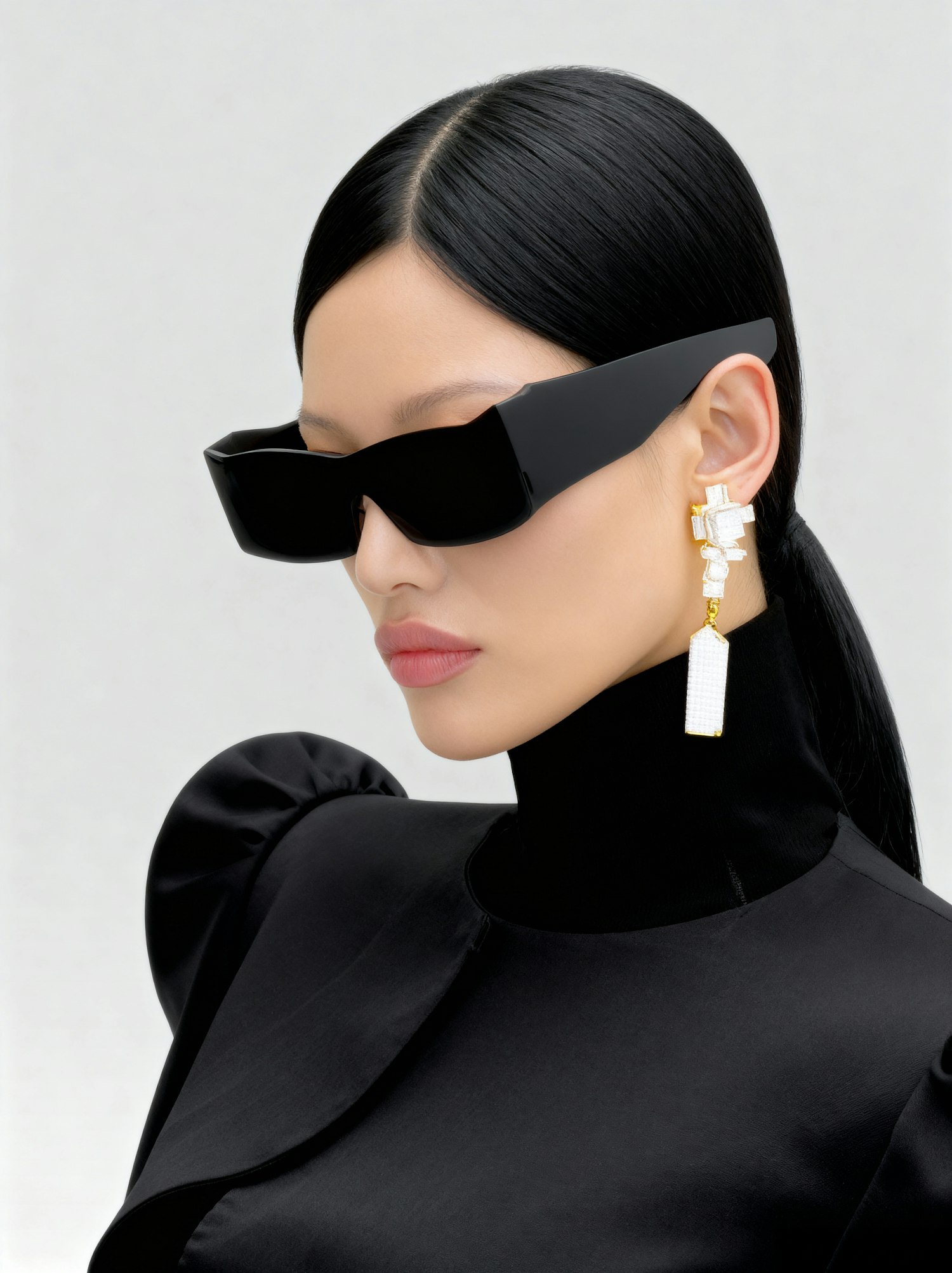 Stylish individual in futuristic black sunglasses, sleek black outfit, and bold geometric earrings against a neutral background.