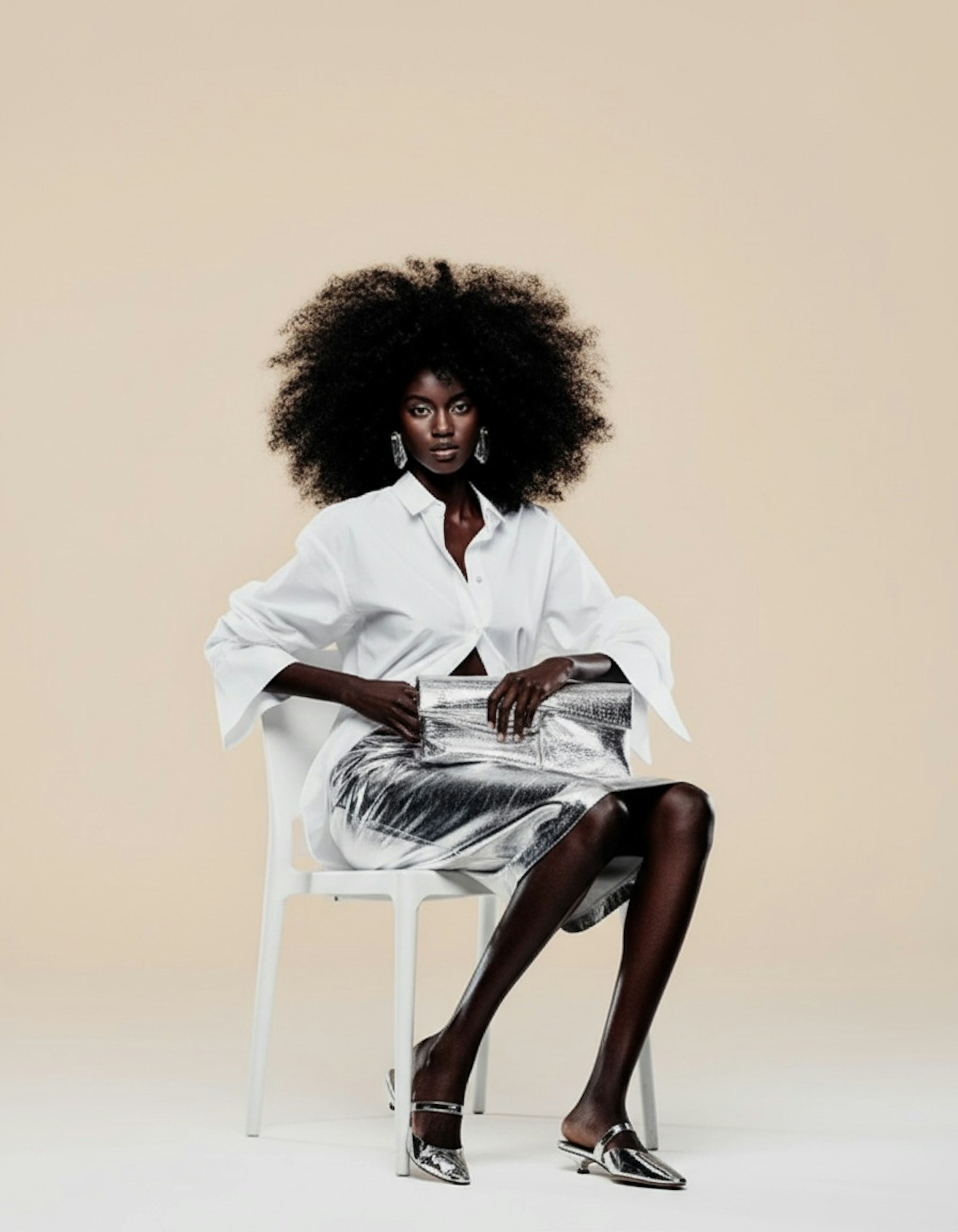 A fashionable person in a white shirt and silver skirt sits on a chair, showcasing a chic and modern style with matching accessories.