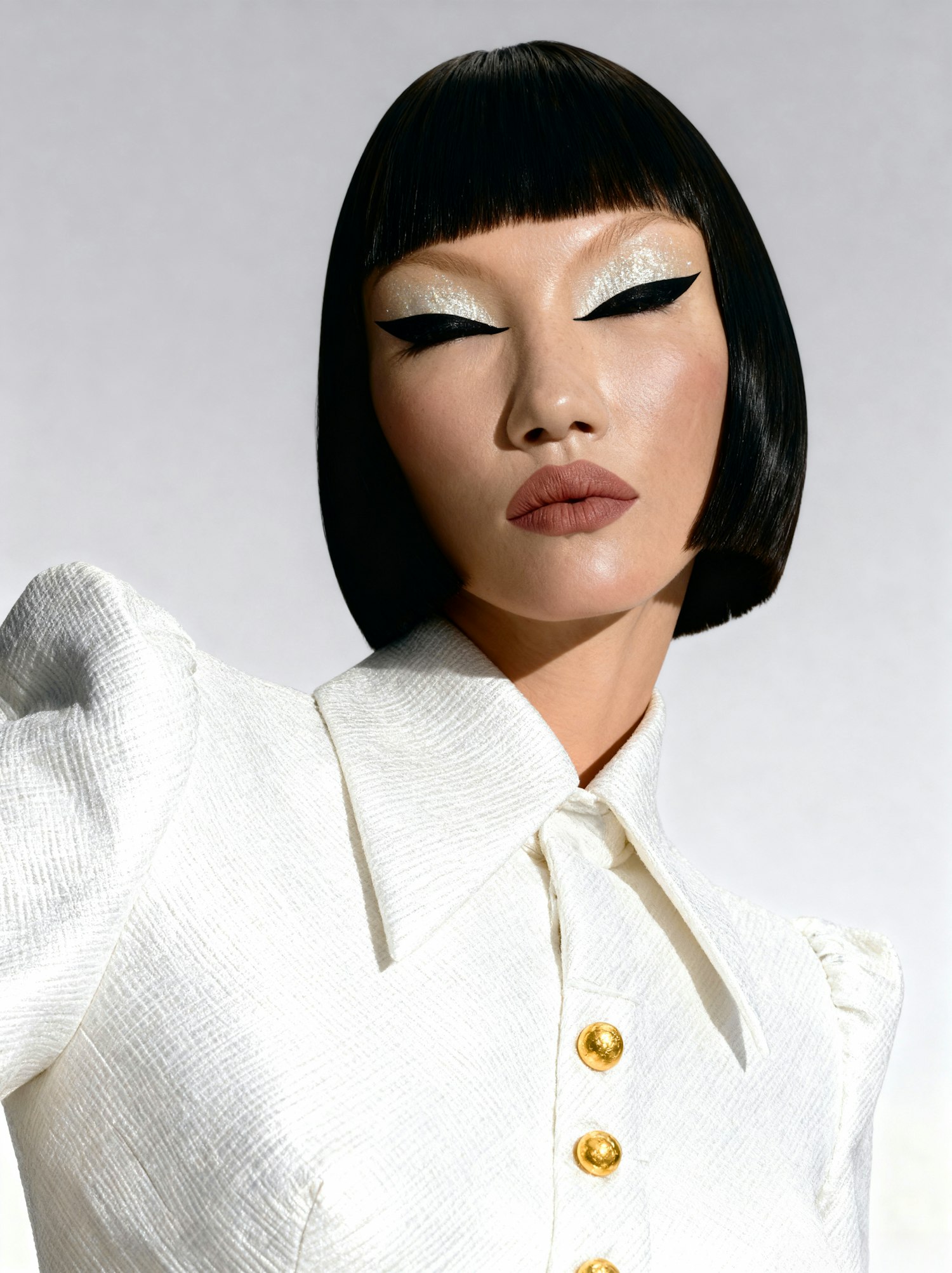 A stylish individual with bold makeup and a sleek bob hairstyle, wearing a white blouse with gold buttons against a minimal background.