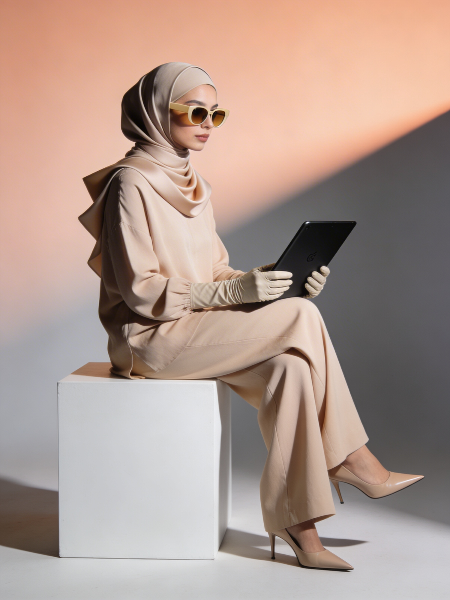 A high‑definition, minimalist editorial portrait. A stylish person sits in a side‑profile pose on a white cube, holding a sleek matte‑black tablet with no visible branding. They wear a soft‑sand monochrome outfit: relaxed long‑sleeved top, wide‑leg trousers, and a sculptural hijab with clean folds. Accessories include beige‑tinted sunglasses, fitted gloves, and pointed heels. The background transitions from warm peach to cool grey with dramatic lighting. No logos, no watermarks, no extra text.