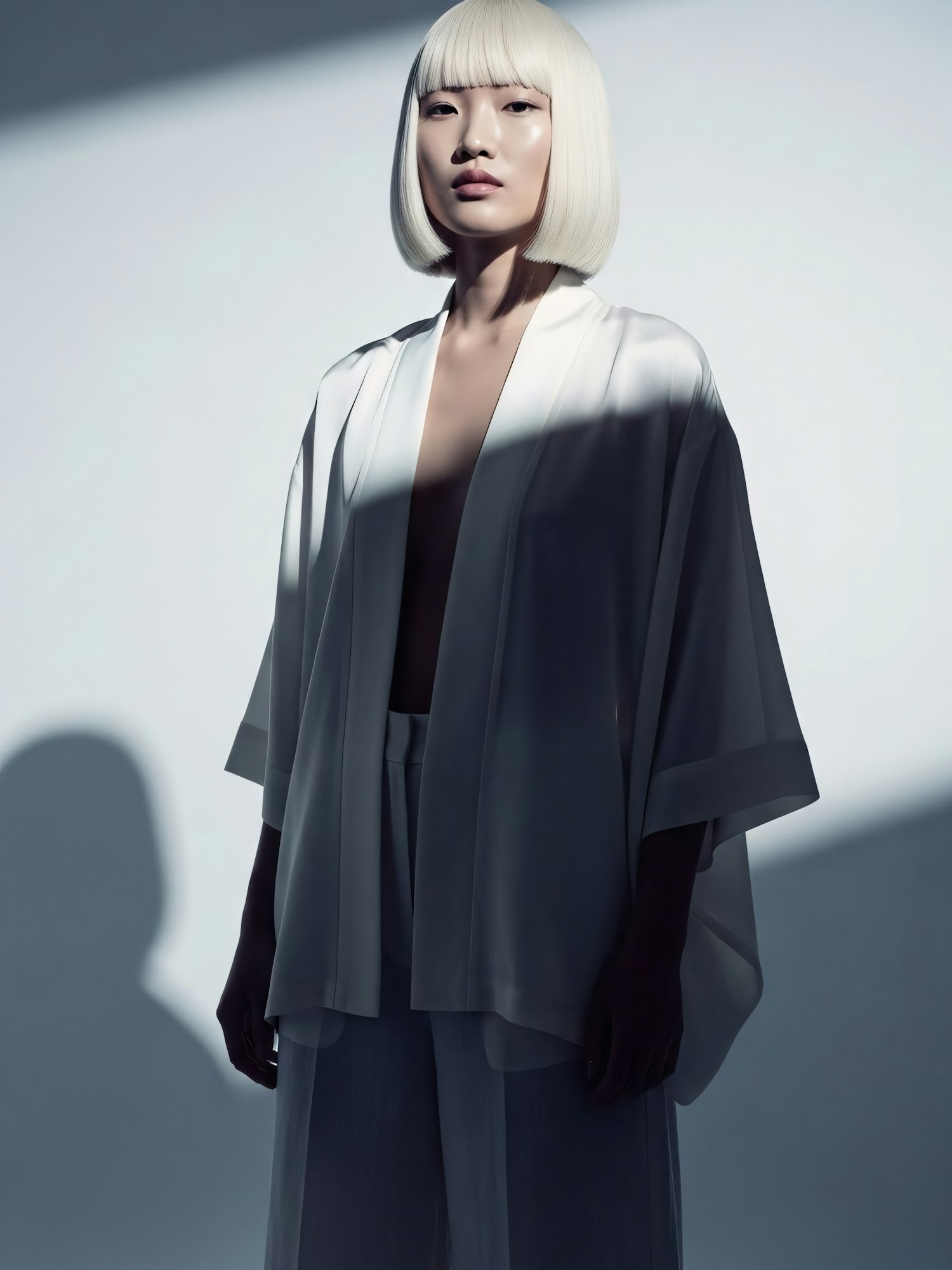 A striking portrait of a person with a platinum blonde bob, wearing a flowing white outfit in dramatic lighting.