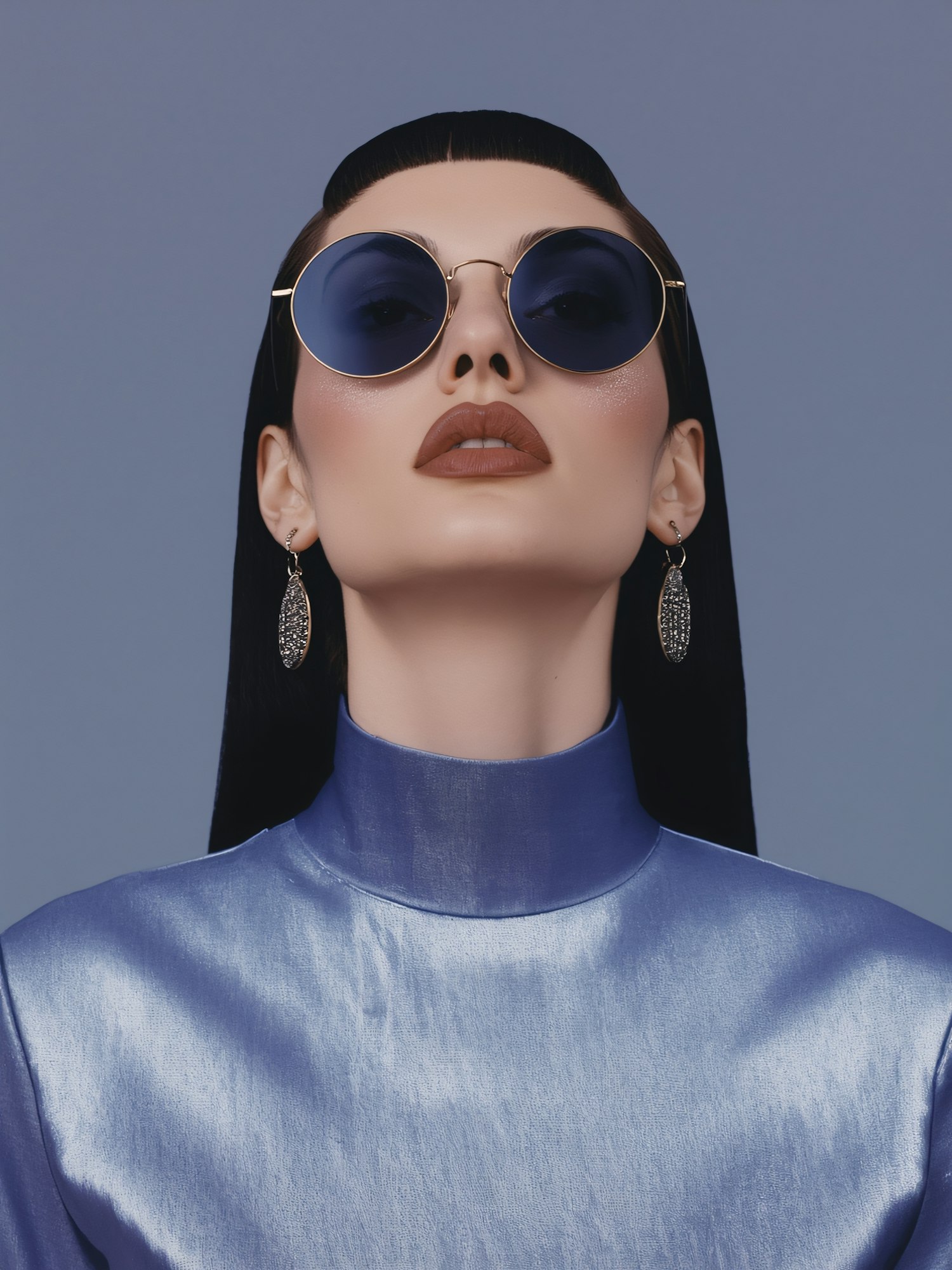 A fashionable portrait of a person in a metallic blue top, round sunglasses, and elegant earrings against a muted blue background.