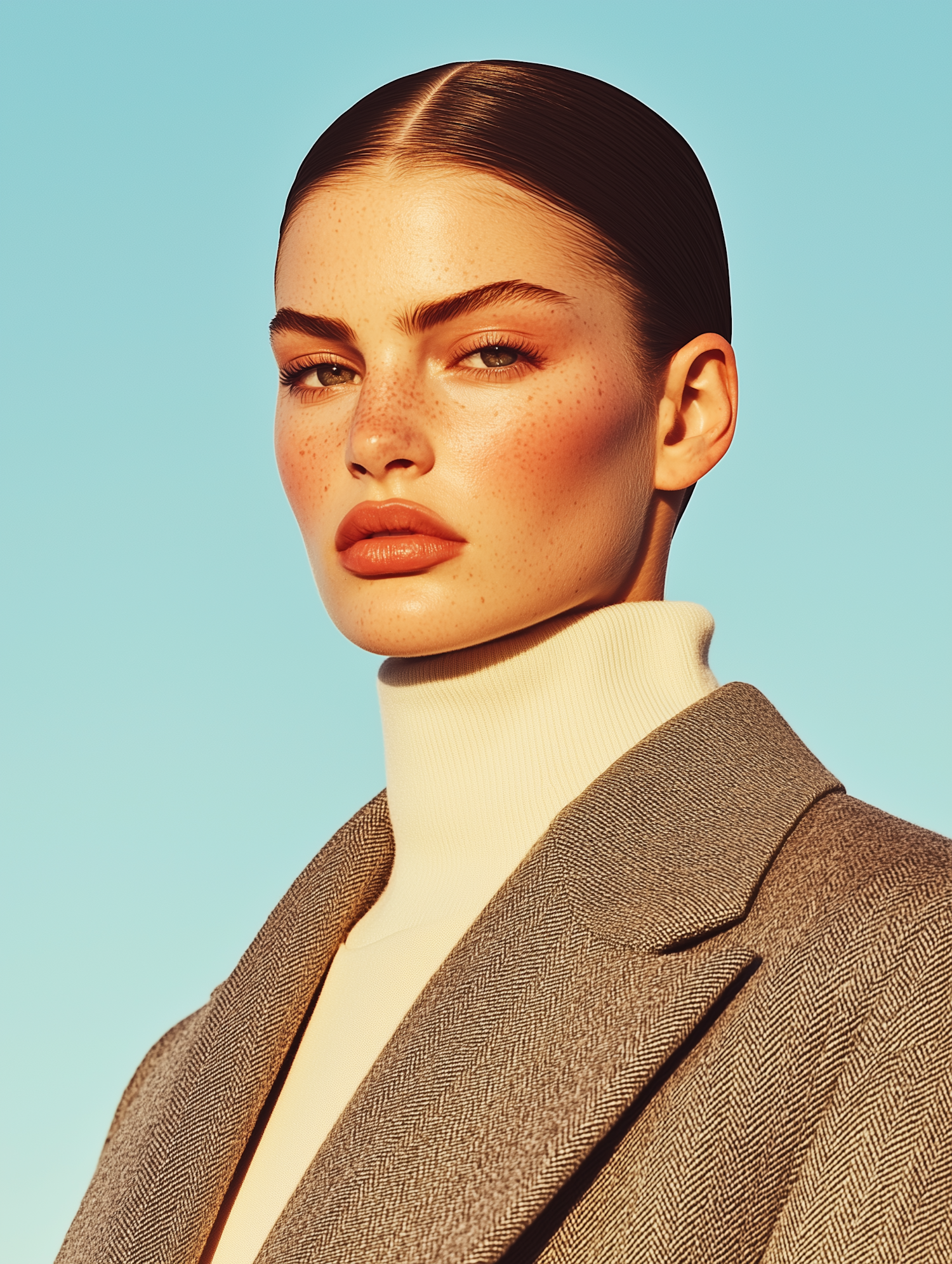 Elegant woman with sleek hair and freckles in a herringbone blazer against a clear blue sky, exuding confidence and style.