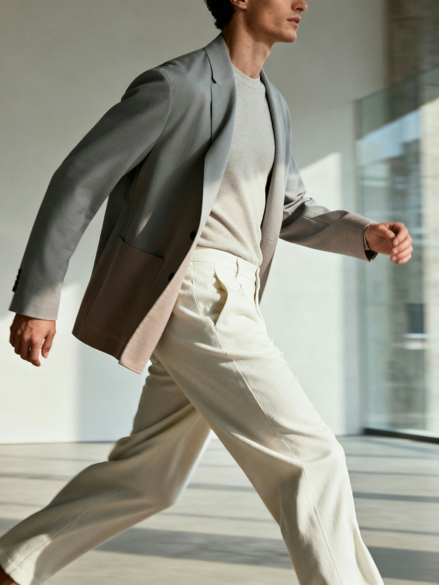 A man in a light gray blazer and cream trousers walks confidently in a modern, sunlit space with large glass windows.