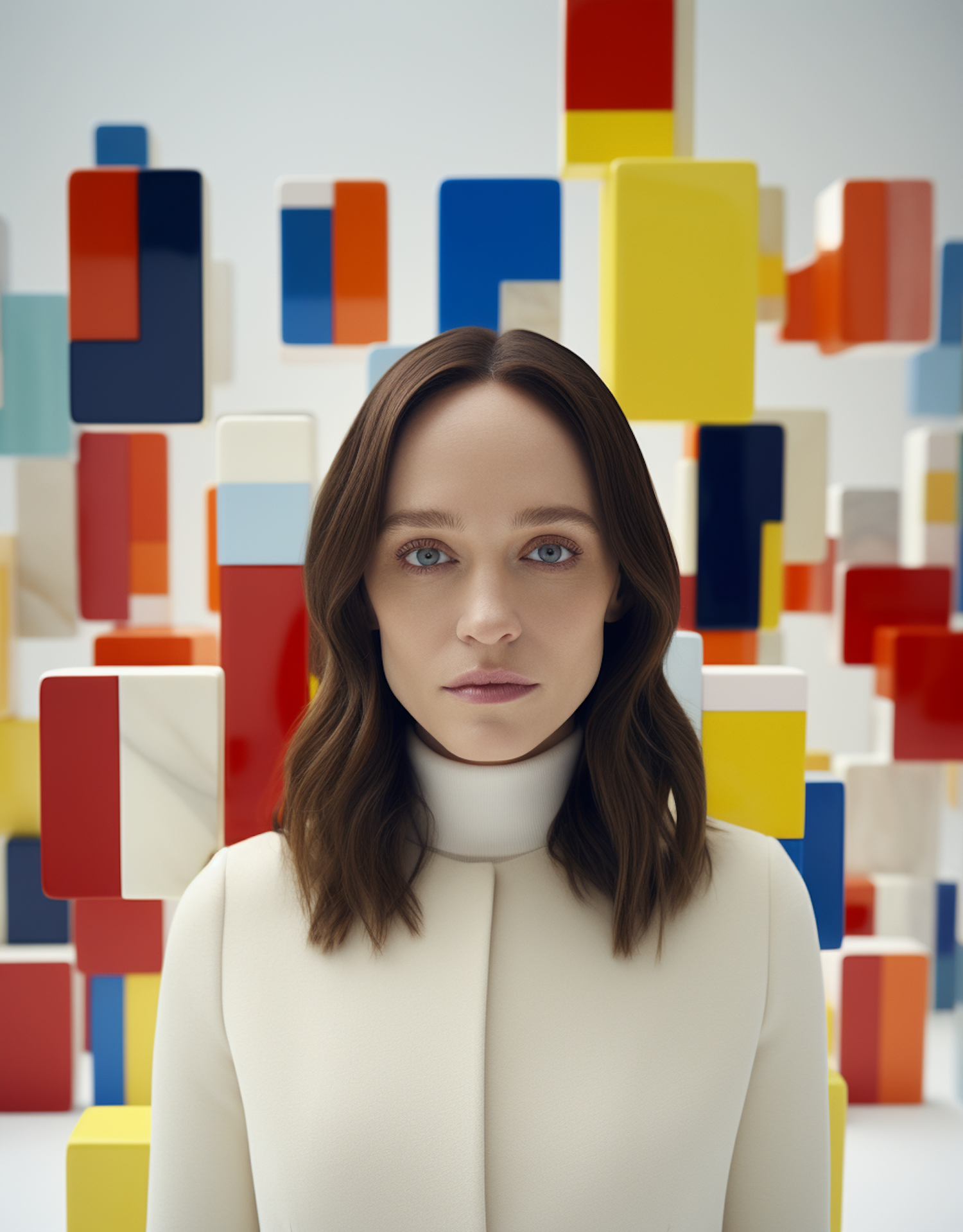 Caucasian woman with brown hair in front of colorful geometric blocks, wearing a cream top. Modern and artistic vibe.