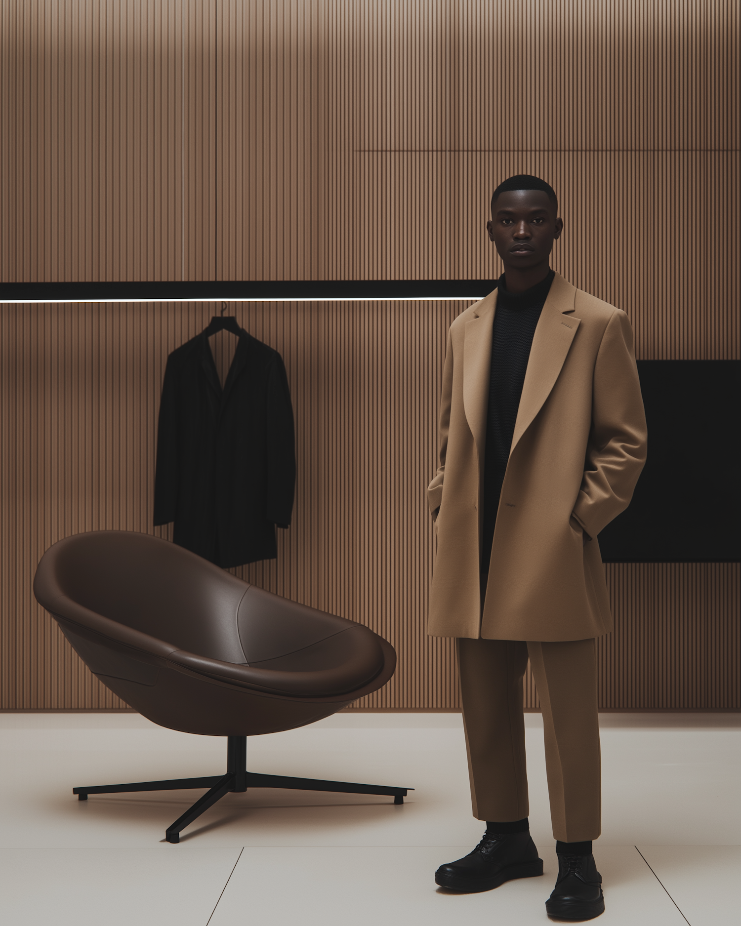 Stylish man in camel coat in a modern room with wooden panels and a sleek leather chair, exuding sophistication and elegance.
