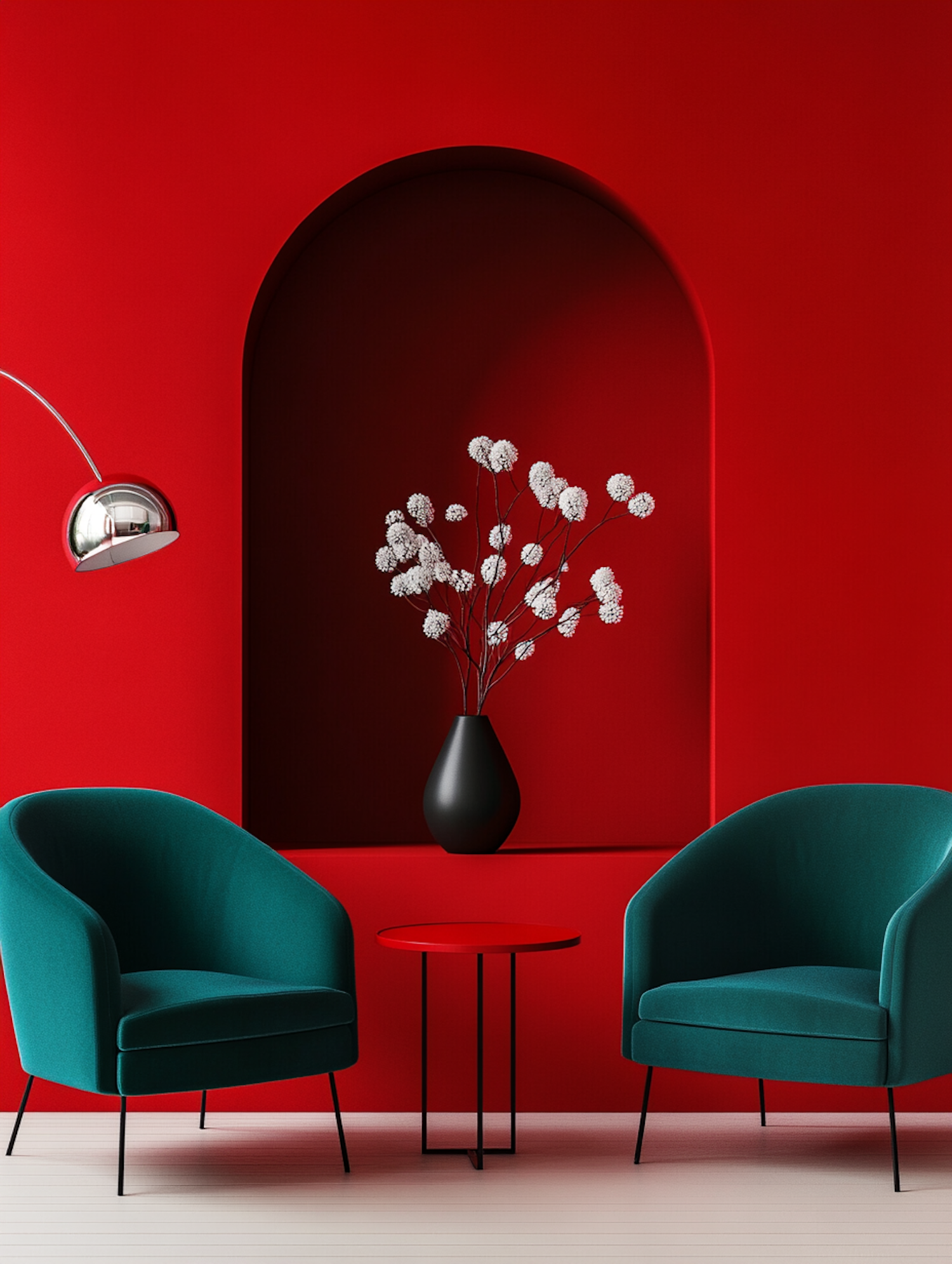 Modern interior with red walls, teal armchairs, and a black vase with white flowers. Minimalist design with bold colors and sleek furniture.