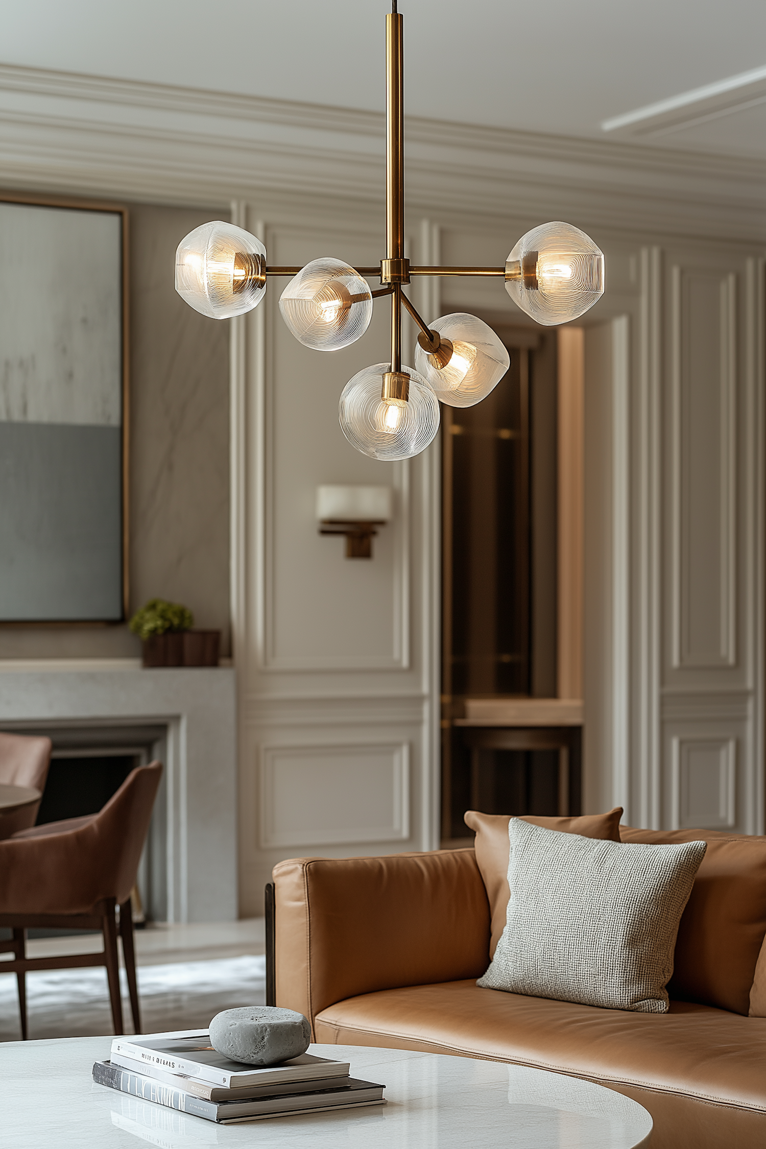 Elegant living room with modern chandelier, tan leather sofa, and chic decor. Warm lighting and sophisticated design elements.
