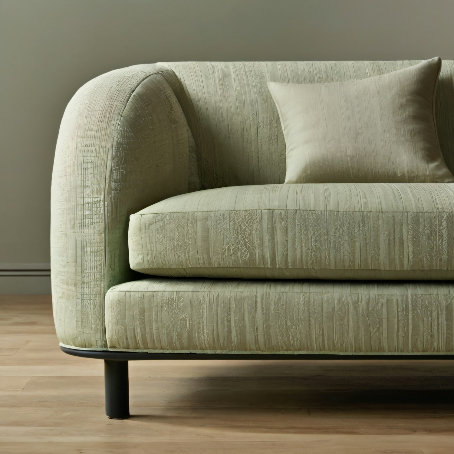 Elegant light green sofa with textured fabric and black legs, featuring a matching cushion on a wooden floor.