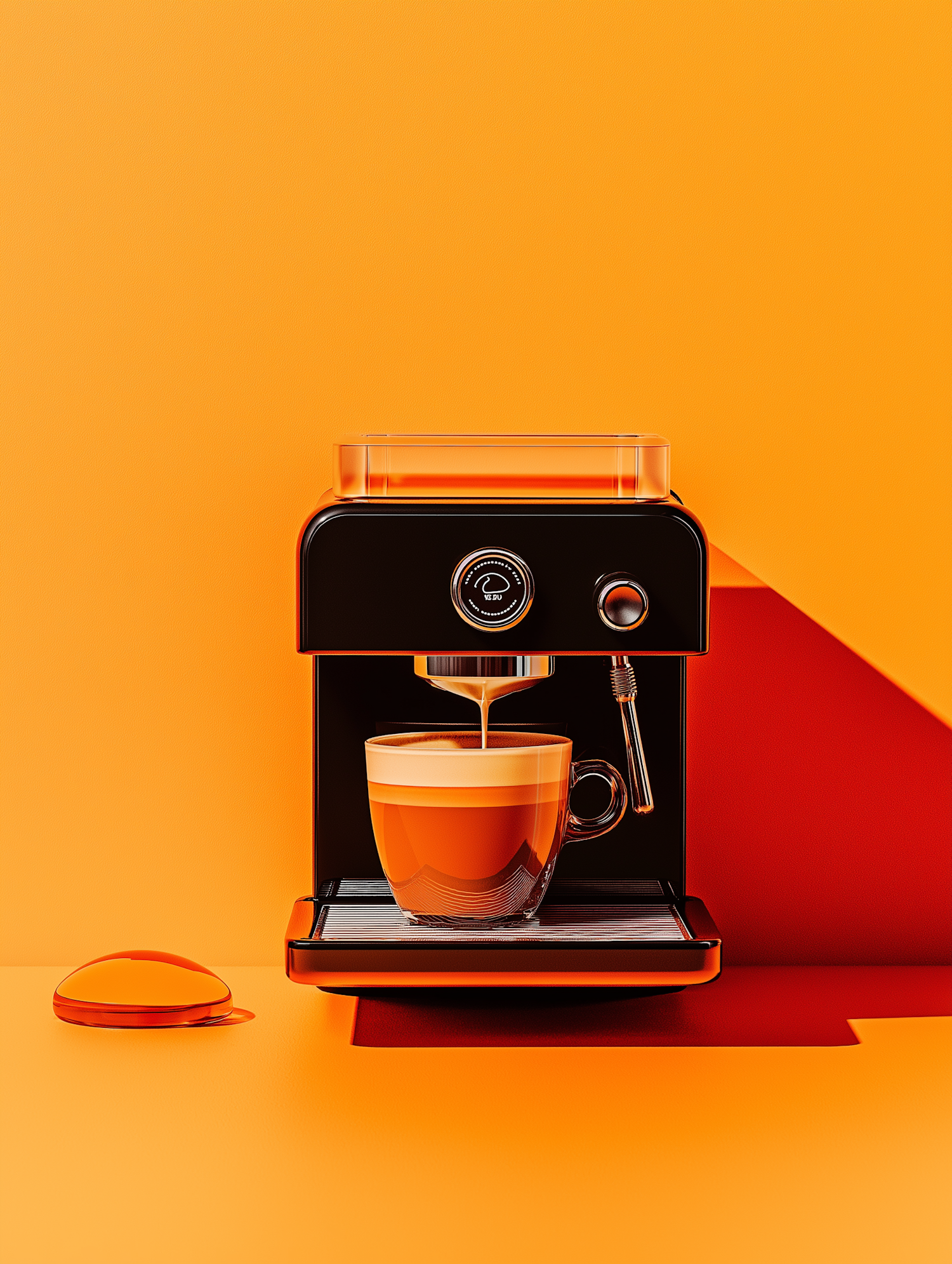 A stylish black espresso machine brewing coffee into a glass cup, set against a bold orange background with sharp shadows.