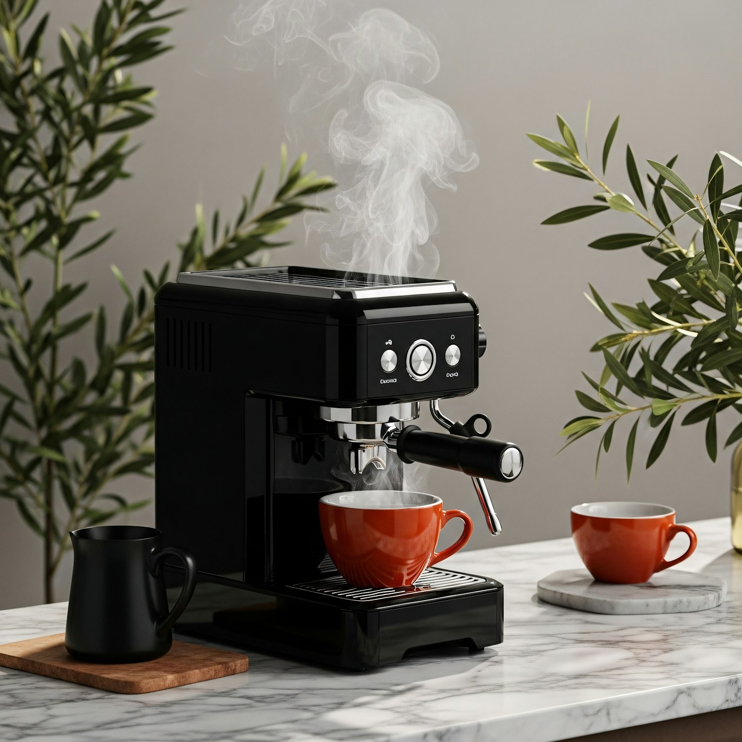 Modern black espresso machine brewing coffee into an orange cup, with a stylish setup on a marble countertop and greenery in the background.