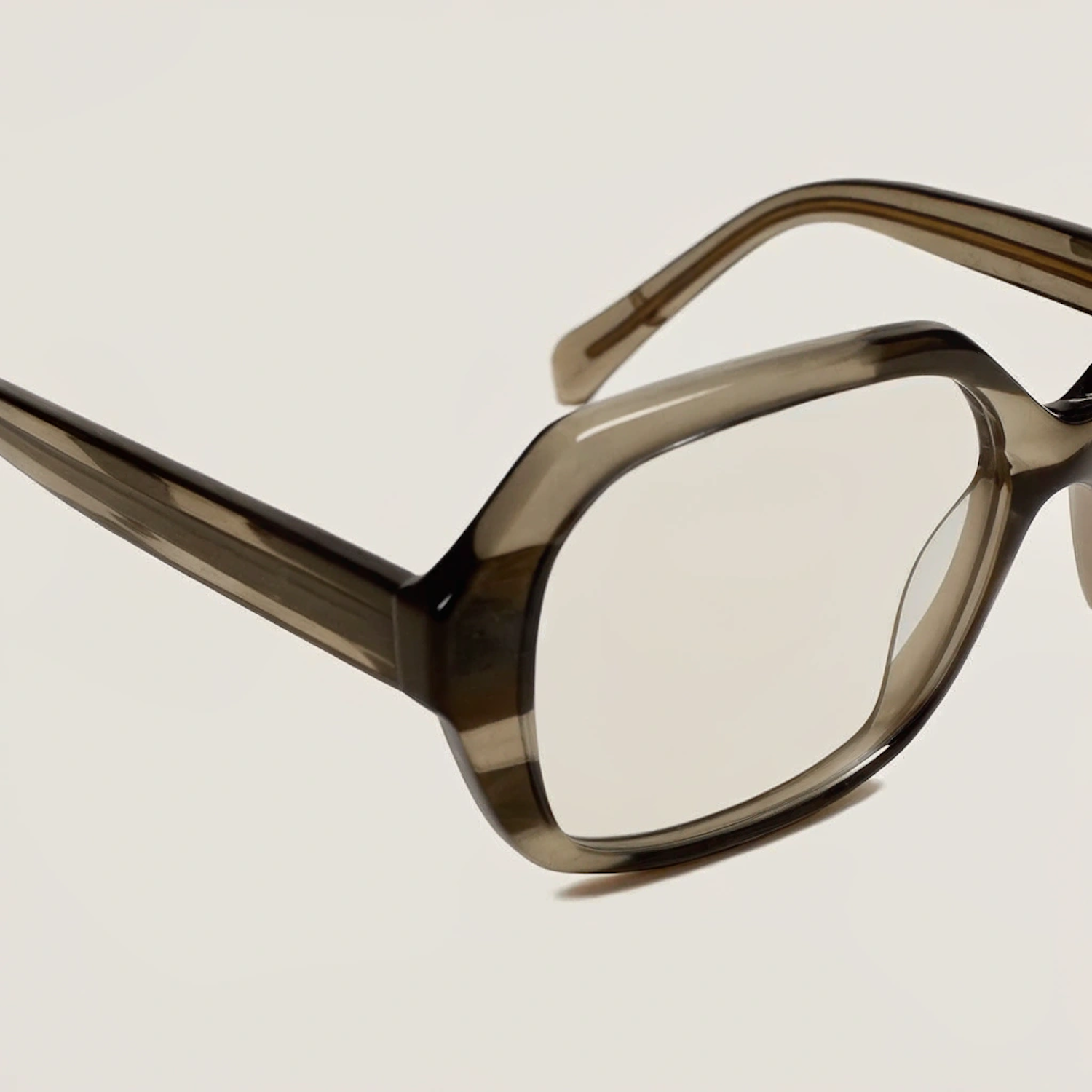 Modern eyeglasses with translucent gray acetate frames and clear lenses, set against a light beige background for a sleek look.