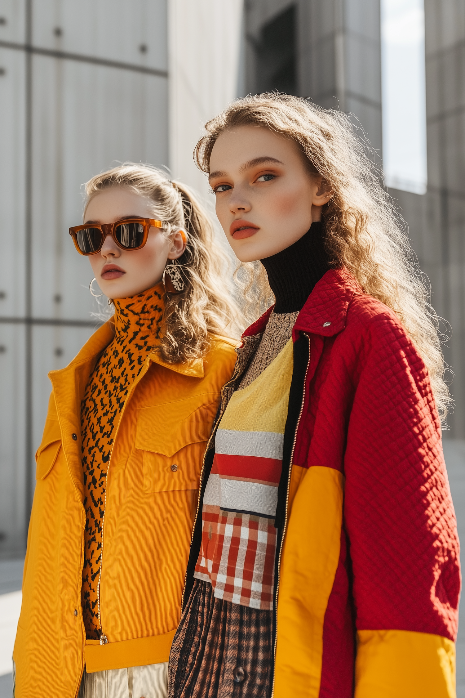 Two fashionable women in vibrant jackets pose confidently in an urban setting, showcasing modern style and bold colors.