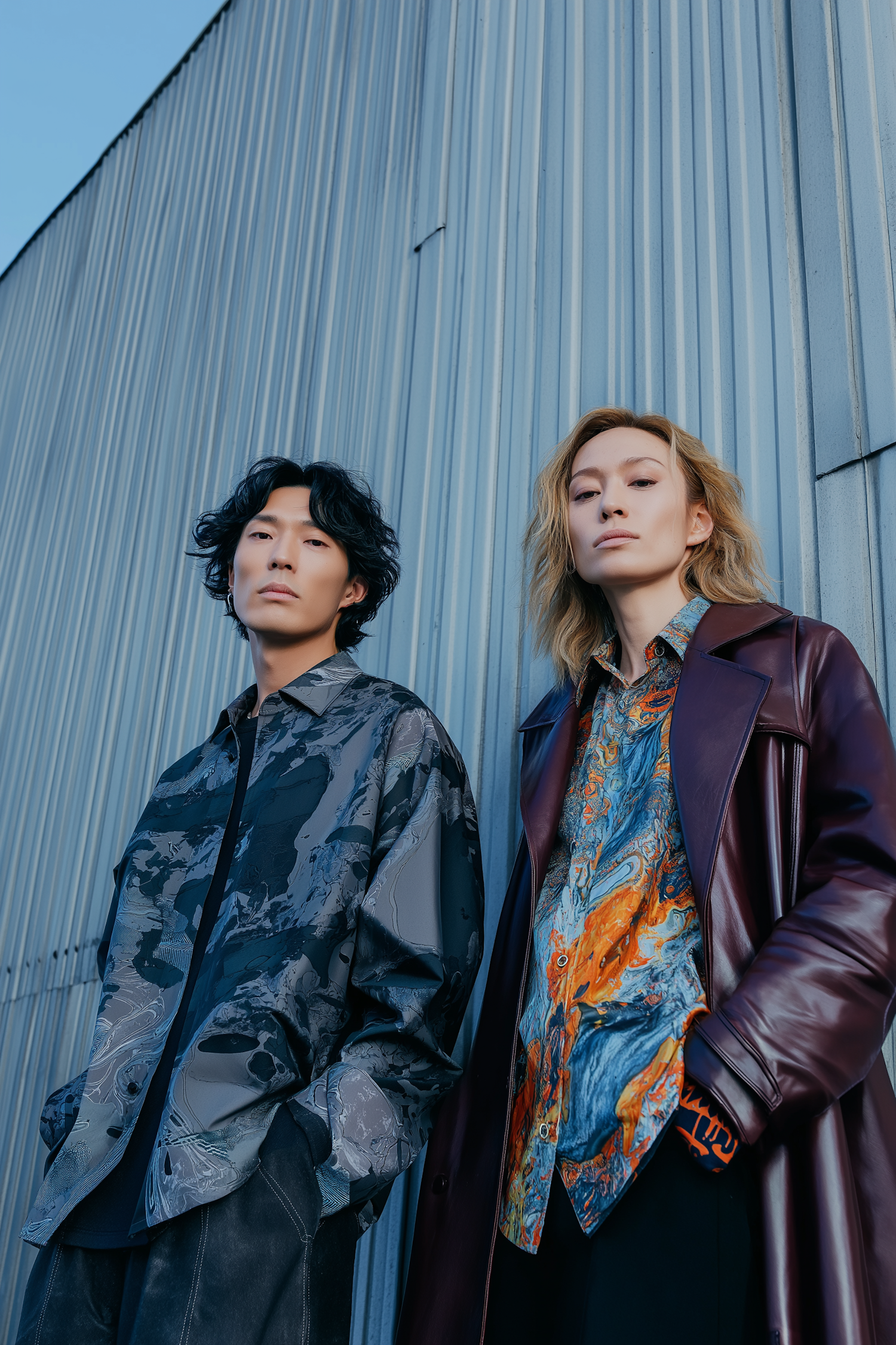Two stylish individuals pose against a metal wall, showcasing bold, artistic fashion with vibrant patterns and modern designs.