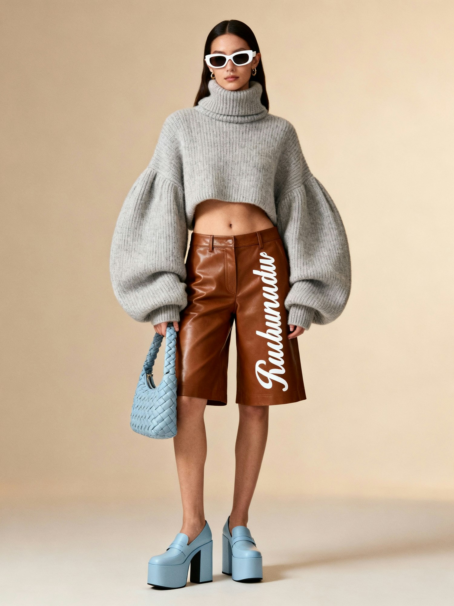 A confident woman standing indoors against a plain background that complements her warm brown skin tone. She wears a textured, oversized light gray turtleneck sweater with voluminous sleeves and a cropped design that reveals her midriff. Her high-waisted, wide-legged brown leather shorts feature vertical white cursive writing, adding a graphic edge. She accessorizes with light blue platform shoes, a matching textured light blue handbag, and white-framed sunglasses. The look is bold, playful, and editorial—blending sculptural knitwear with statement accessories in a modern fashion-forward composition