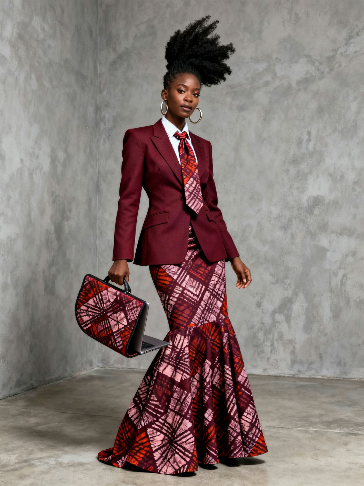 Full-body professional portrait of a Black woman, a singular figure, radiating elegance and strength. She is captured in a very dynamic and dramatic pose, confidently showcasing a unique, high-fashion ensemble: a long ankle length skirt suit. The suit consists of a tailored jacket and a matching skirt, both crafted from a two-colored Adire fabric with a primary color of burgundy, making an undeniable statement, potentially paired with a complementary secondary color subtly within the print. Her hair is styled in a distinctive African dramatic hairstyle, complemented by a stylishly tied neck tie. She accessorizes with striking large hoop earrings and carries a dramatic shaped laptop bag crafted from a similar Adire fabric. The minimalist background features textured gray walls and a smooth concrete floor. Soft, even lighting meticulously highlights the rich textures and intricate patterns of her garment. The style is cinematic, high-definition, and sharply focused, exuding an avant-garde and artistic high-fashion vibe that emphasizes her bold presence and the sartorial statement of her attire."