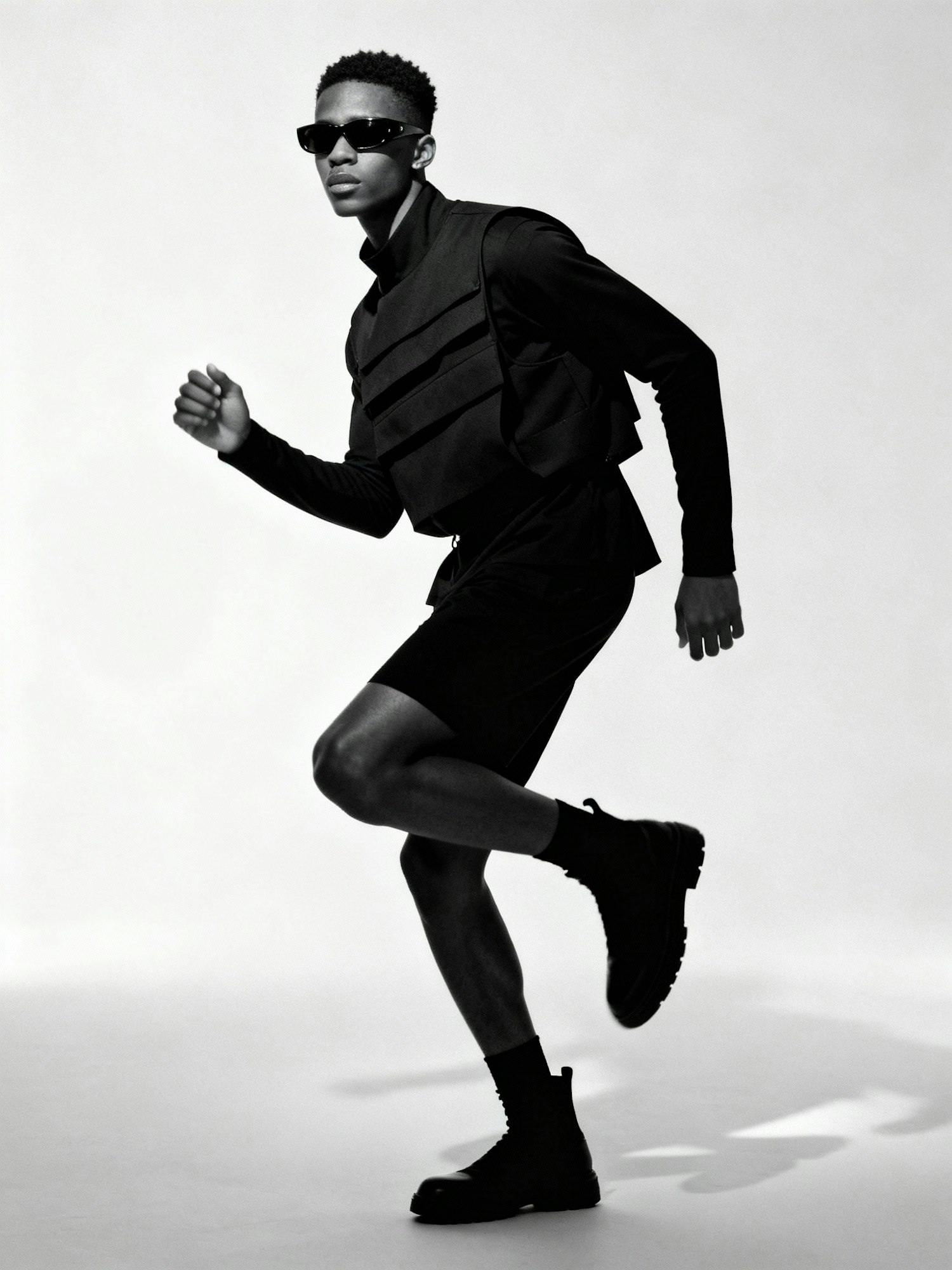 Full-body, ultra-high-definition black-and-white portrait of a stylish individual mid-motion, captured in a dynamic pose that conveys energy and confidence. They wear a sleek black outfit with layered textures and bold sunglasses, their silhouette sharply defined against a minimalist, light-toned studio backdrop. The lighting is directional and soft, casting sculptural highlights across their skin and garment, emphasizing movement and form. The composition is editorially sharp and stripped of distraction, blending streetwear realism with a futuristic edge. The overall mood is modern, modest, and visually striking—ideal for a Gen Z fashion portrait or Afro-fusion identity showcase rooted in motion and clarity.