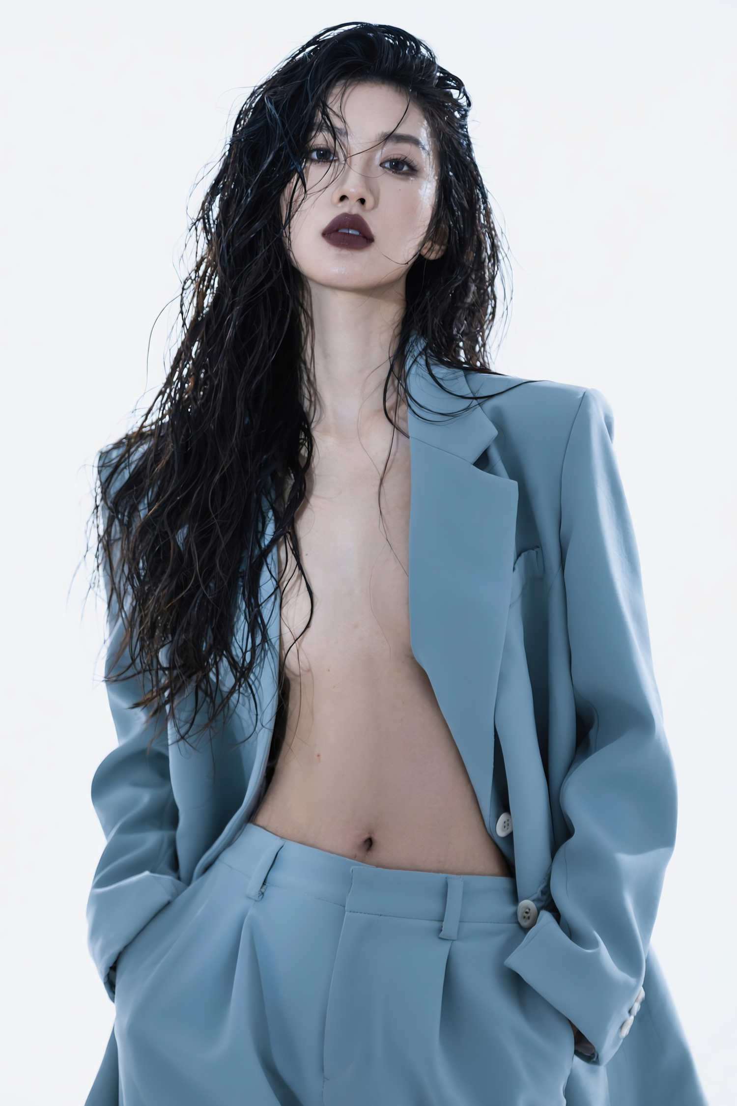 A striking portrait of a woman in a light blue suit, styled with wet hair and bold makeup, set against a minimal background.