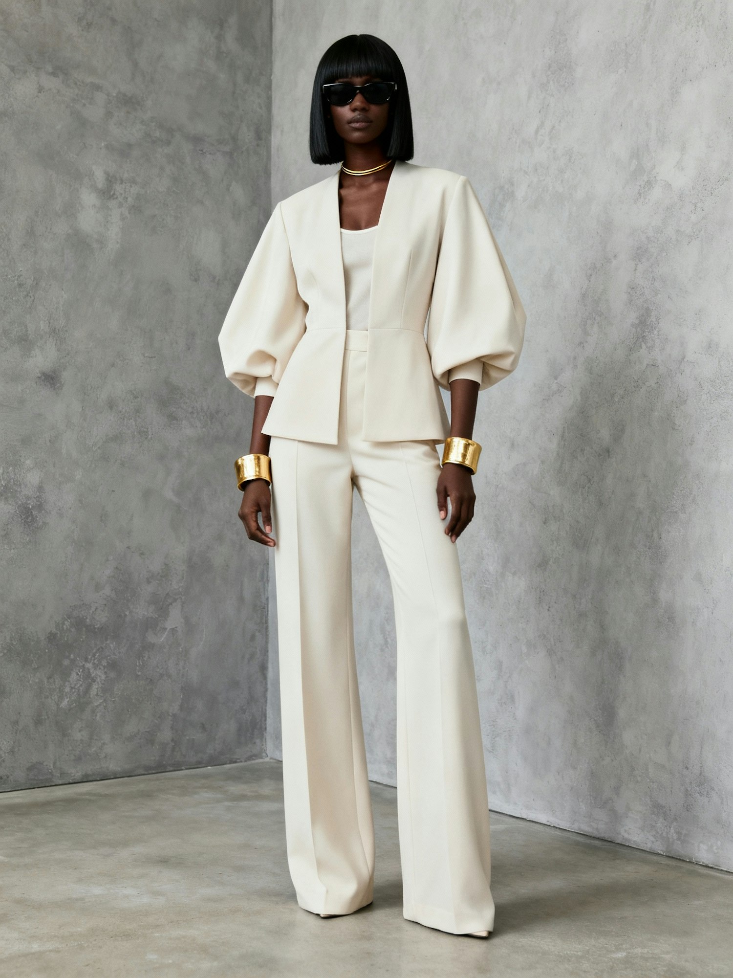 Full-body, high-definition portrait of a stylish Black woman standing against textured gray walls and a smooth concrete floor. She wears a coordinated light-toned outfit with sleek tailoring and clean lines—featuring a structured top with voluminous sleeves and matching wide-leg trousers. Her look is modest yet modern, with a matching inner layer for coverage. Her sleek black hair is styled straight, and she wears dark sunglasses, adding a sharp, editorial edge. Accessories include chunky gold cuff bracelets on both wrists and a thin gold choker necklace, balancing minimalism with bold accents. She stands confidently, with a composed expression and relaxed posture. Soft, even lighting highlights the textures of her garment and the clarity of her silhouette. The overall mood is cinematic, minimalist, and fashion-forward—ideal for a high-style portrait or visual archive celebrating Afro-fusion professionalism.