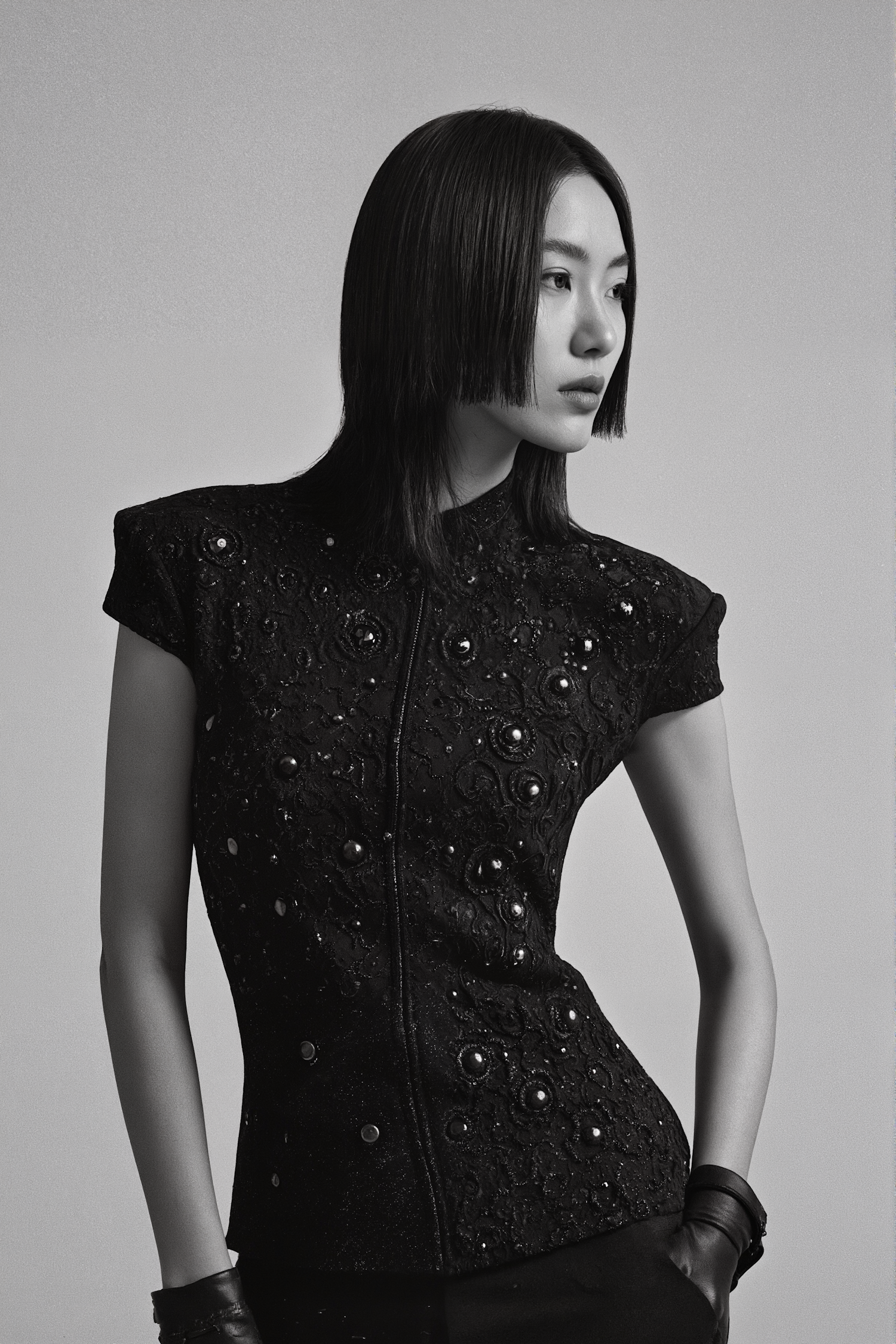 Elegant black-and-white portrait of a poised woman in a textured black top with embellishments, sleek hairstyle, and black gloves.
