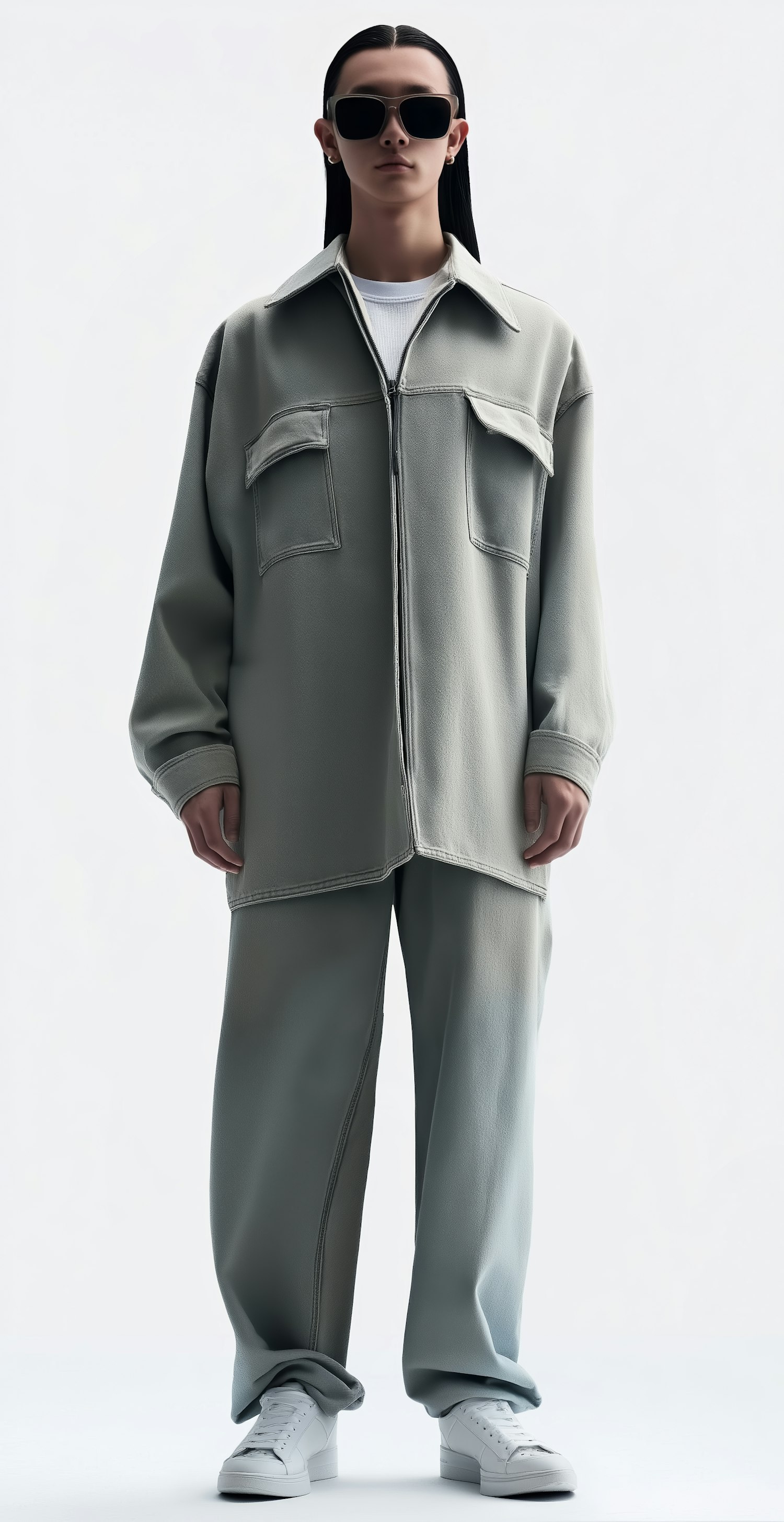 Stylish individual in a light gray oversized outfit with sunglasses and white sneakers, showcasing modern and minimalist fashion.