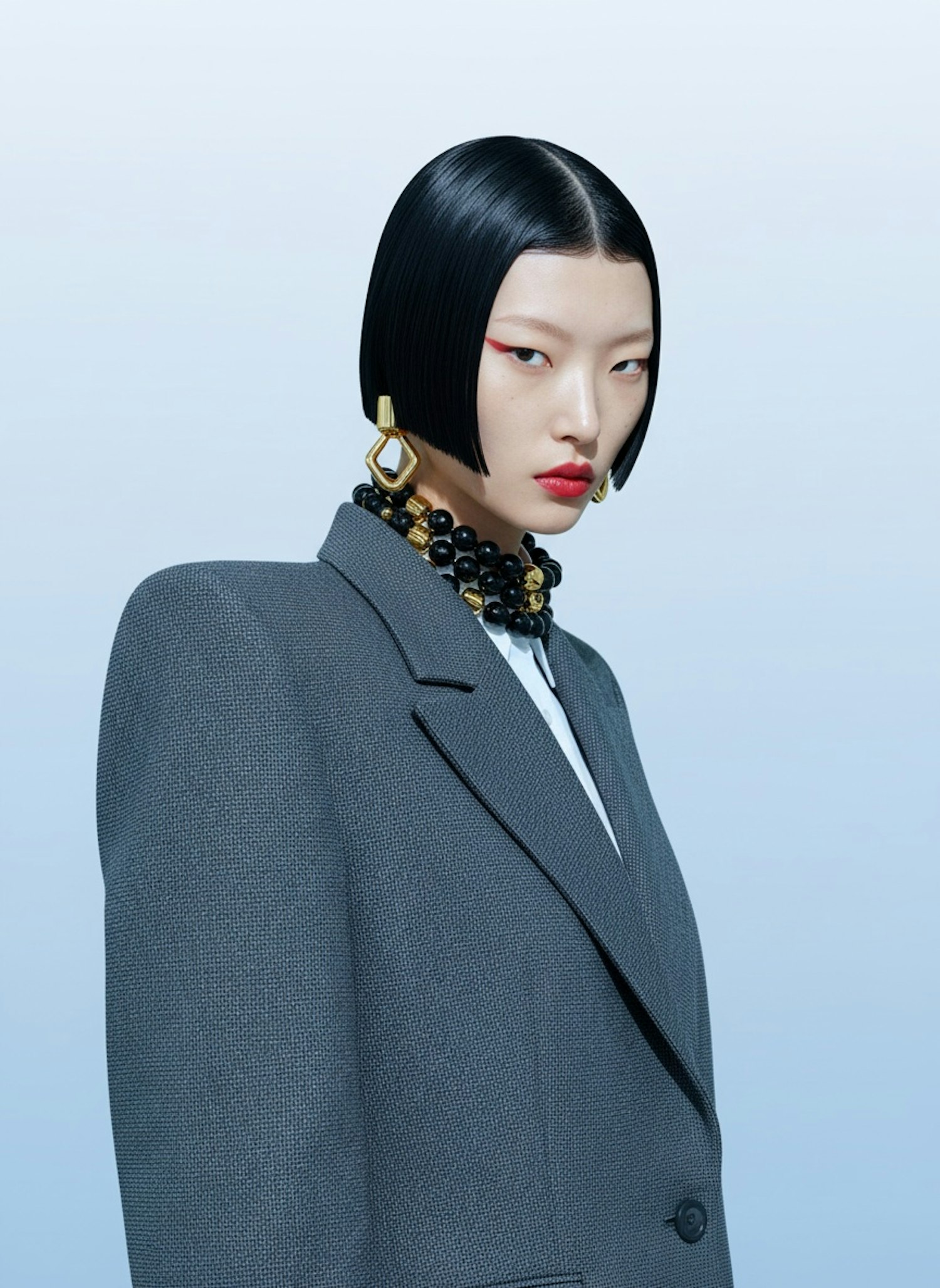 A stylish individual with a sleek bob haircut, bold makeup, and statement accessories against a clean blue background.