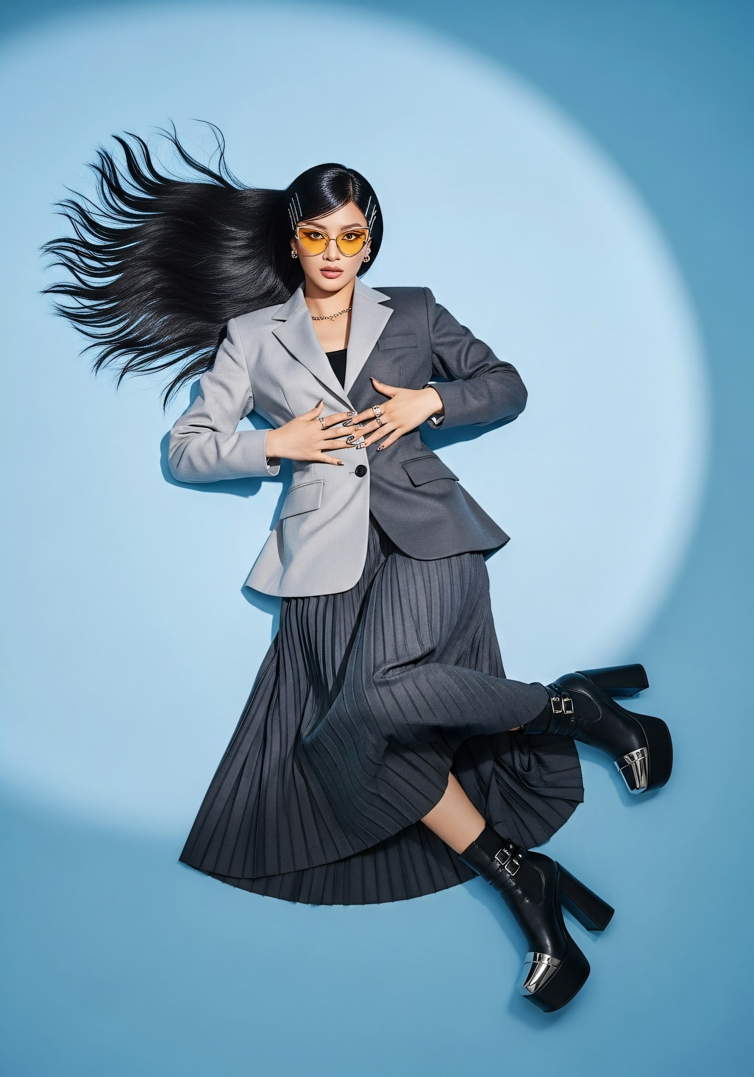 A fashionable individual in a two-tone blazer and pleated skirt, accessorized with yellow glasses and platform boots, on a blue background.