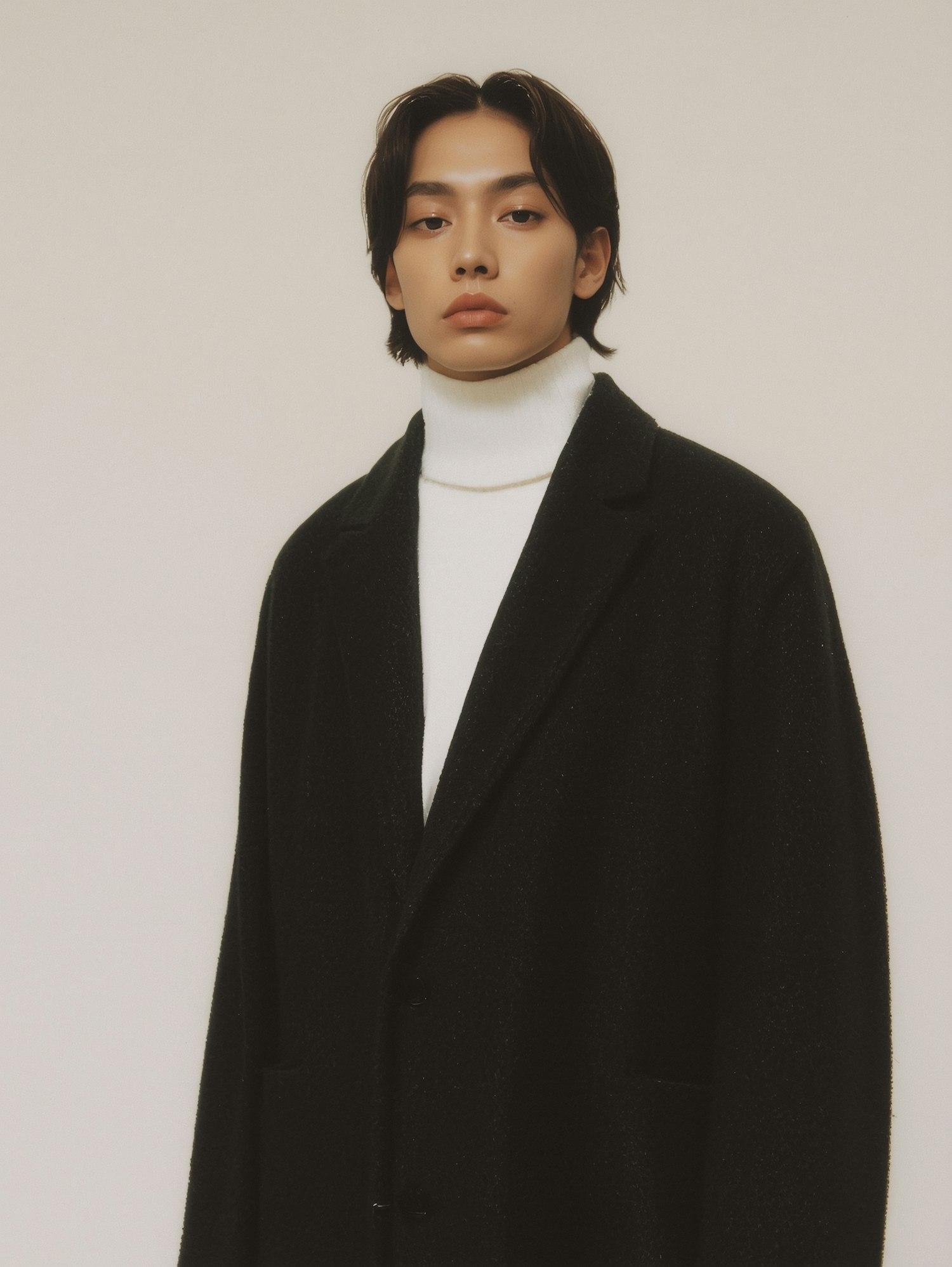 Stylish individual in a black coat and white turtleneck, set against a neutral beige background, showcasing minimalist fashion.