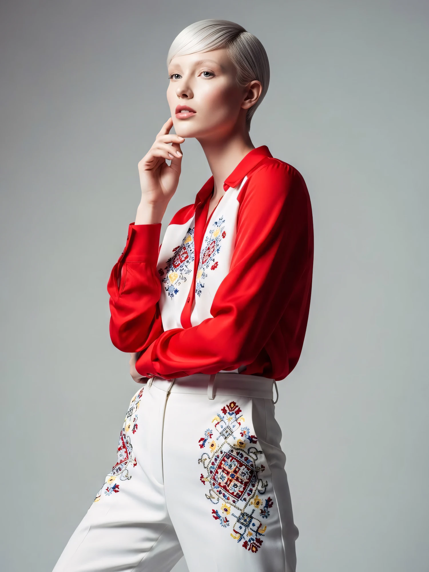 Stylish individual in a red blouse and white embroidered pants, showcasing modern fashion with intricate patterns and bold colors.